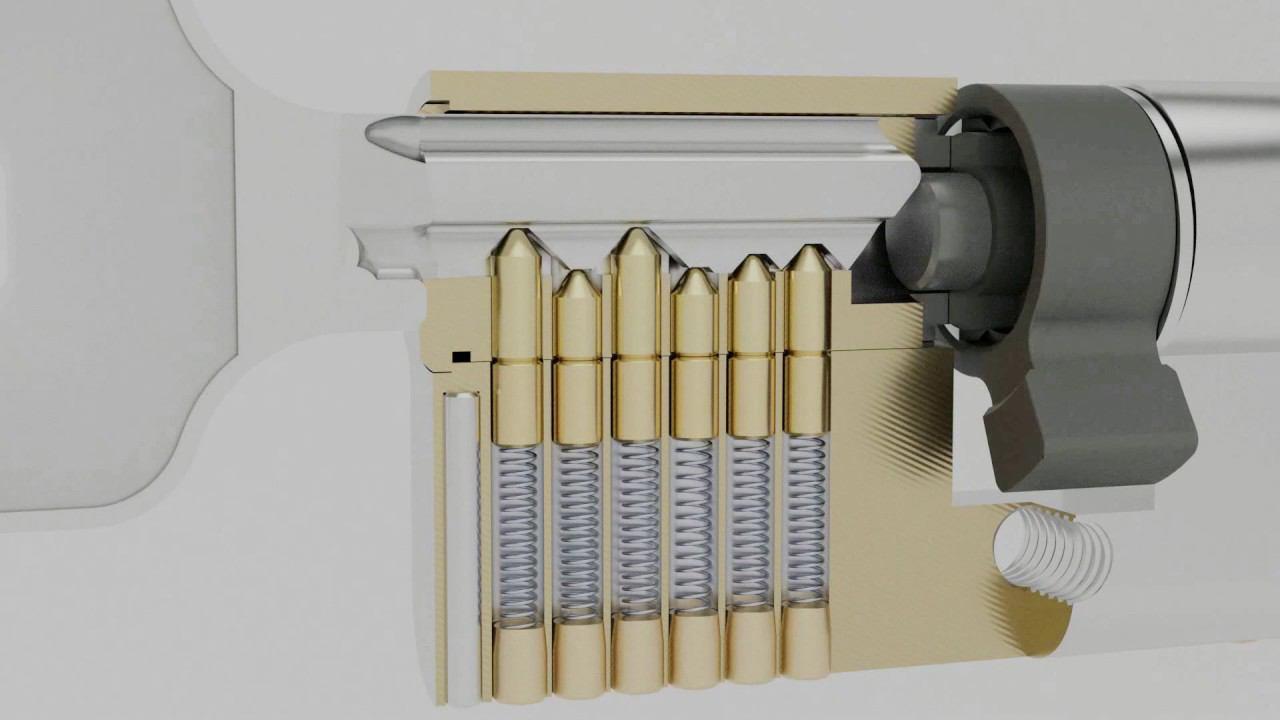 Запирающие штифты выталкивают секреты и блокируют цилиндр. Если каждый из секретов сдвинуть на правильное расстояние, то запирающие штифты выровняются по щели и перестанут мешать вращению.