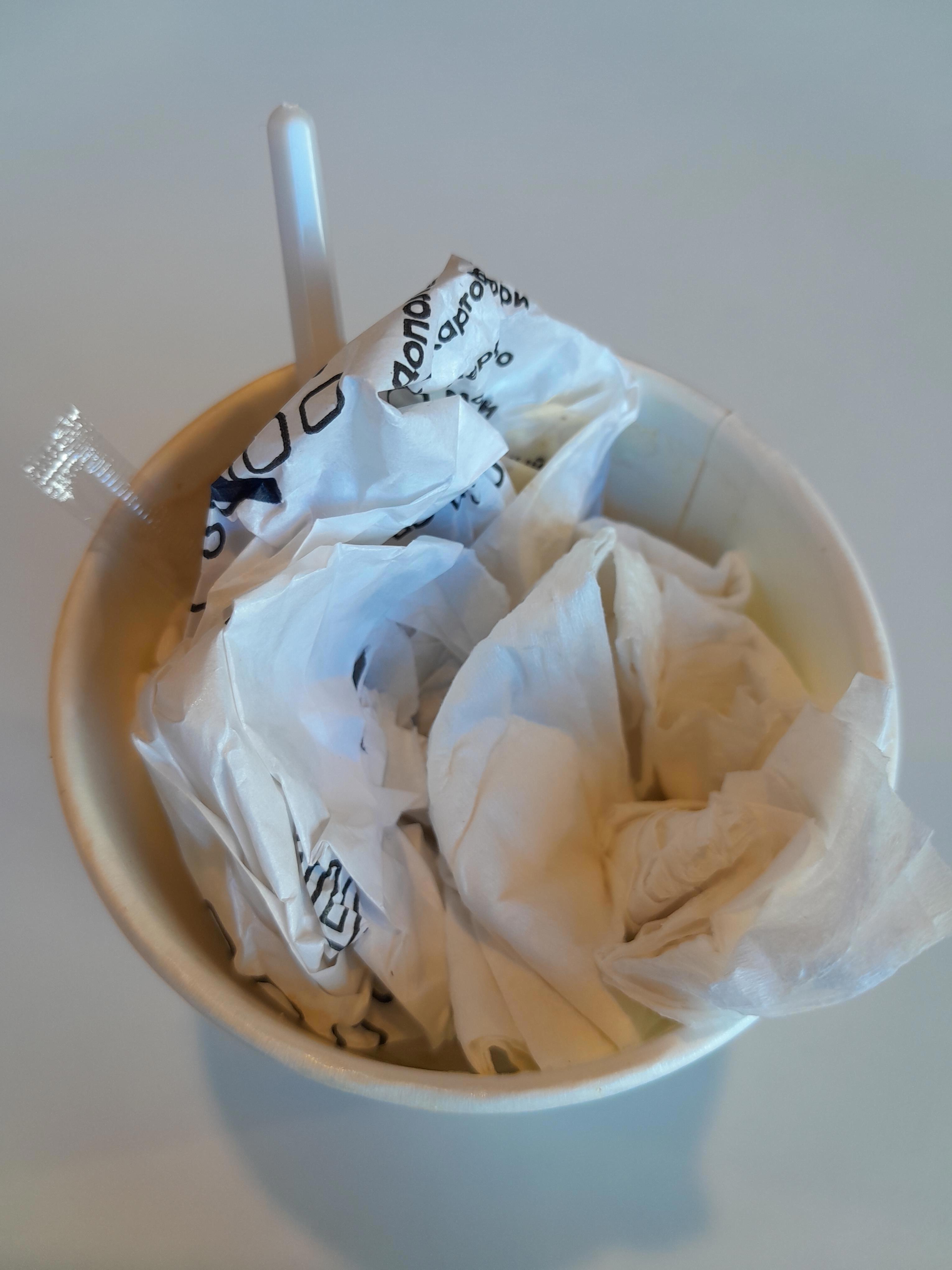 А я вот вдруг подумал, ну как бы вот просто, как вариант - а ежели перекусил, сидишь, сытый такой и в общем-то умиротворённый, так ведь обёртки от обеда - они ж тоже красивые. Ну по своему так, как остатки воспоминаний о прекрасной шаурме, например, или бургере