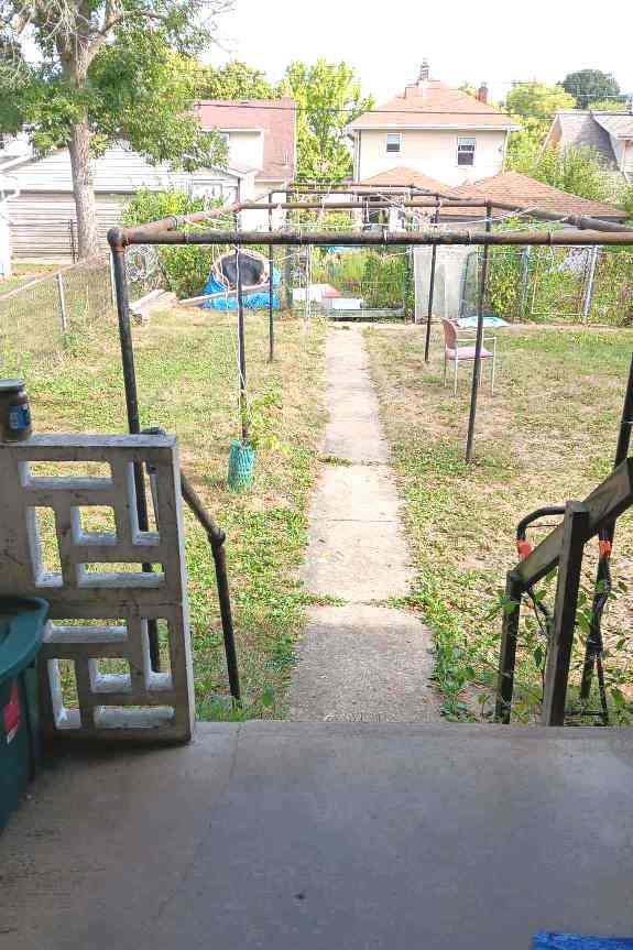 Потом по дорожке через участок, открыть ворота (или широкую калитку), подкатить к краю (там стенка высотой примерно в метр - метр-двадцать, когда-то был гараж, а теперь осталась площадочка), отвязать ремни и... уронить.