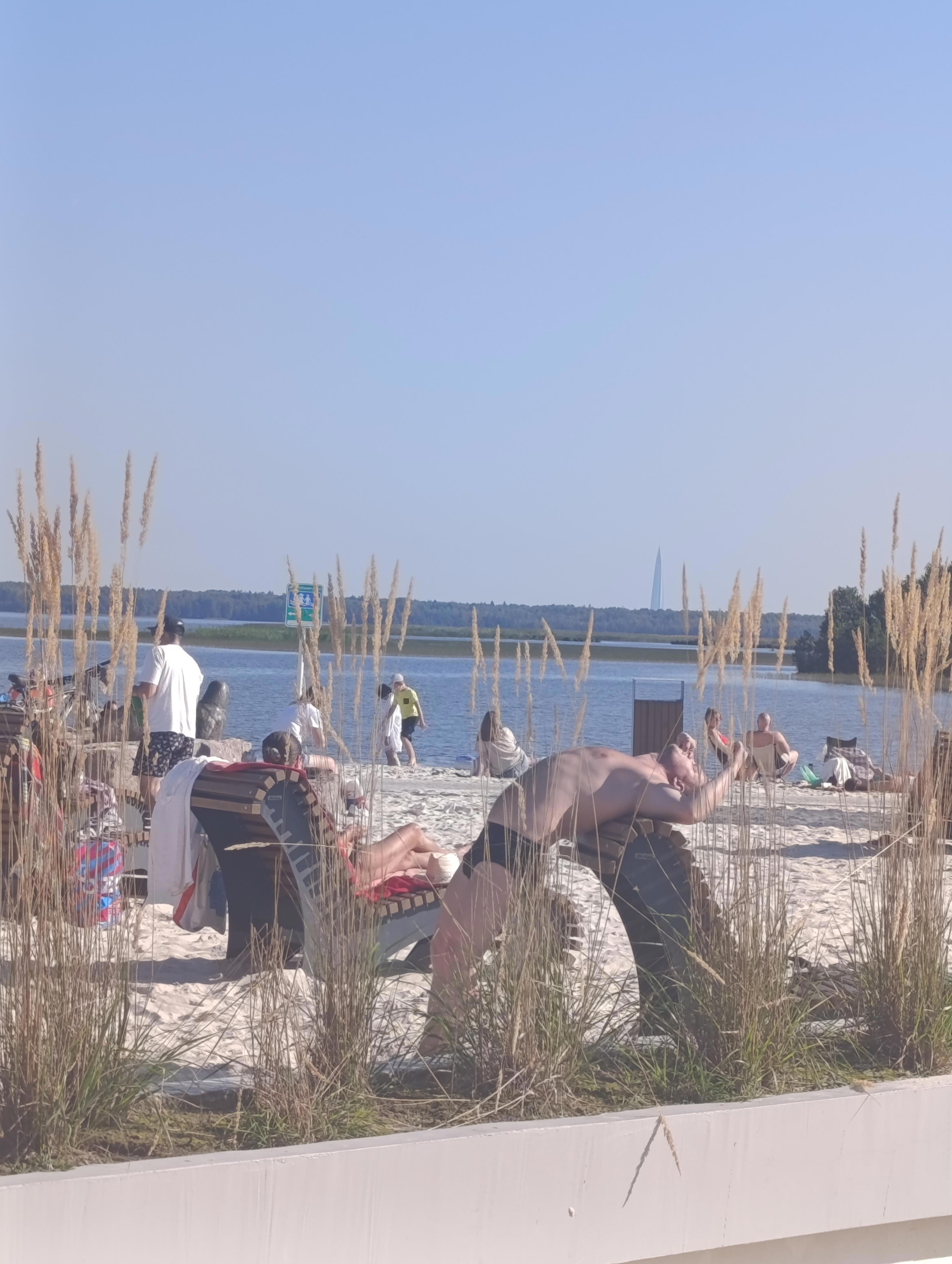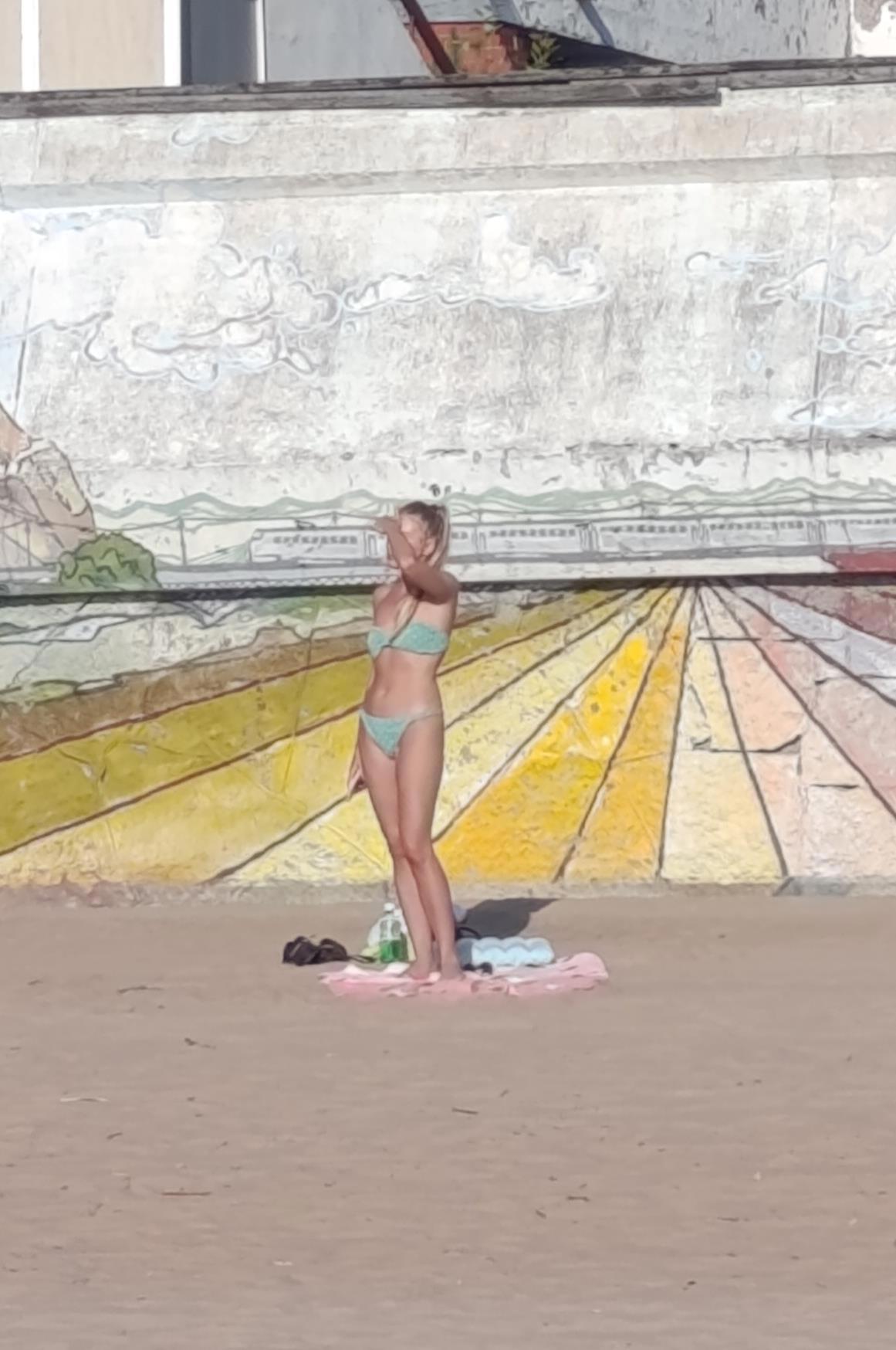 Начали мы сегодня культурно обогащаться с пляжа «Северный». Куда организаторы не поленились и привезли мелкий белый песочек, говорят, как на Ибице. Много лежаков, душ, туалет и пара, нежно обнимающая друг дружку людей в обычных трусах и футболках, дарили надежду, что купальники не проблема.Муж заявил, что вода зелёная, поехали отсюда.