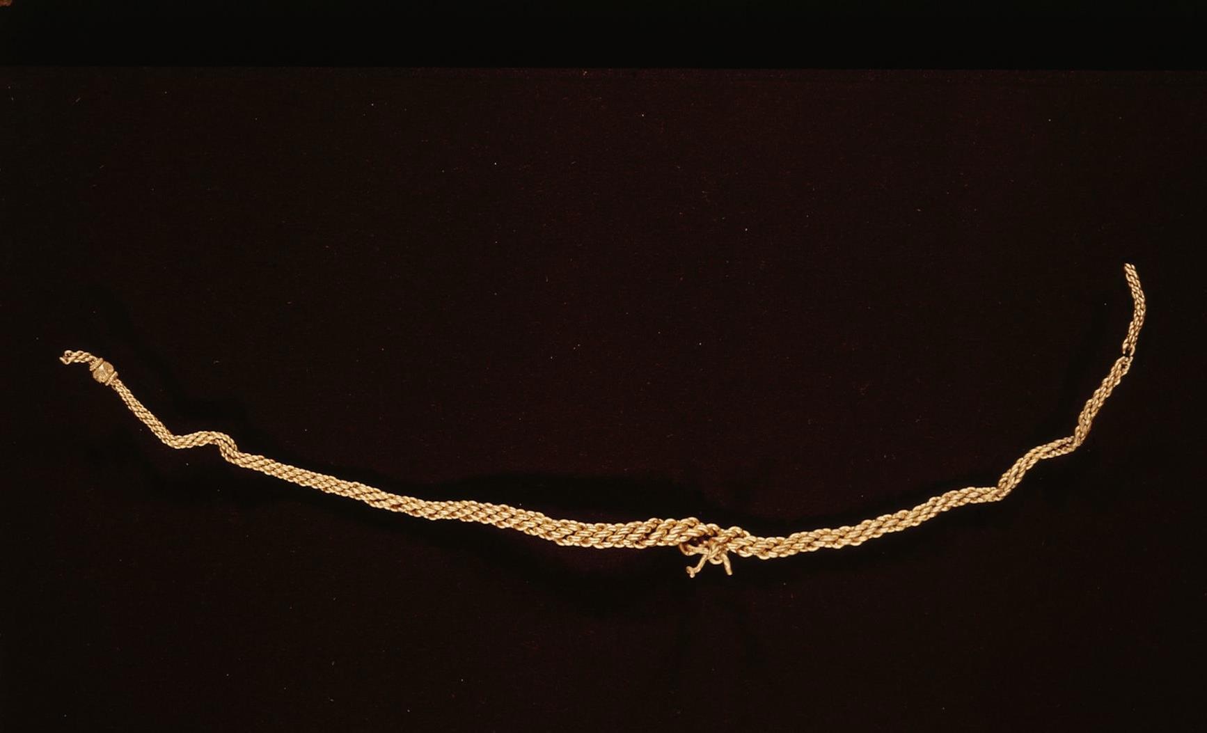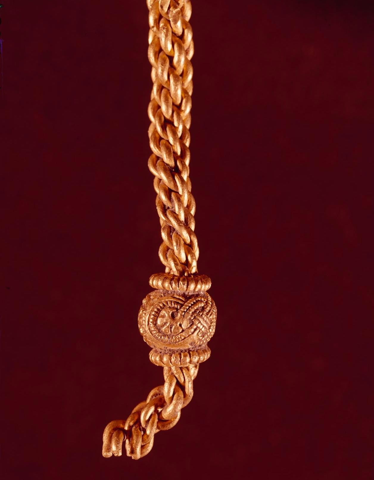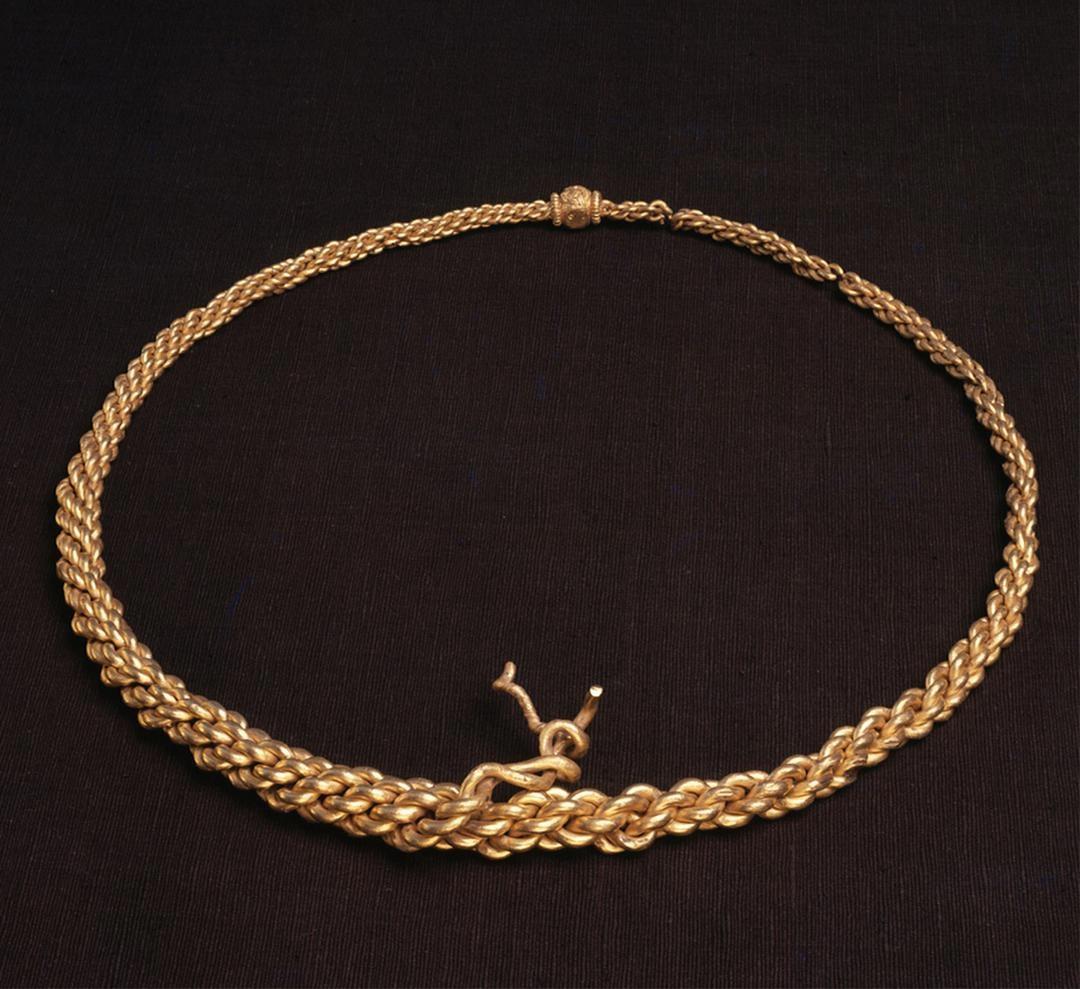Но вернемся к гривнам. Собственно, ради чего я этот пост и затеяла. В моём произведении она серебряная. Вес её составляет 2,5 марки, это чуть больше полукилограмма. А вот пример золотой гривны эпохи викингов. Украшение было обнаружено датскими археологами в 1977 году в Тиссо (Каммельгорден). Эта золотая гривна весит примерно 1,8 кг(!), её диаметр — около 30 см.