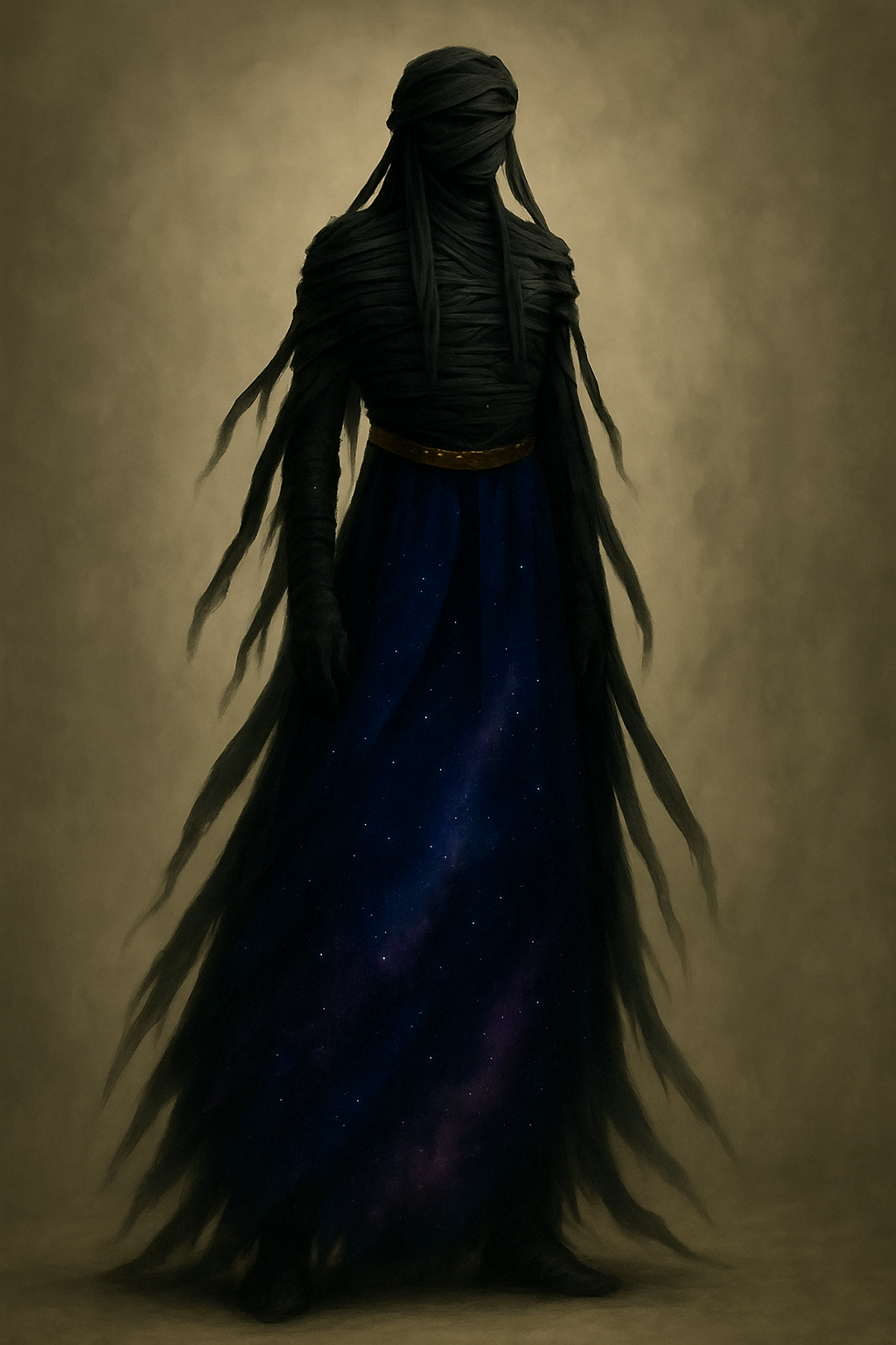 Артур принялся что-то рассказывать — о голосах, о видениях, о том, что море здесь говорит, — но Люциус его уже не слышал. Всё его внимание поглотила тёмная точка у основания маяка. Там, едва различимая дверь, приоткрылась. И в проёме возник силуэт. Невероятно длинный и неестественно худой. Тело его было обмотано длинными, развевающимися на ветру чёрными тканями, а от пояса до земли ниспадала тяжёлая, фиолетово-чёрная мантия, сливающаяся с тенями. Силуэт был размыт, будто сквозь дым, но Люциус видел, как он медленно поднял руку — длинную, туманную — в немом, многообещающем приветствии.