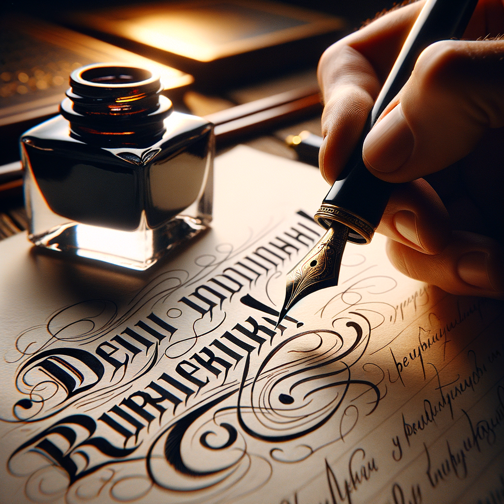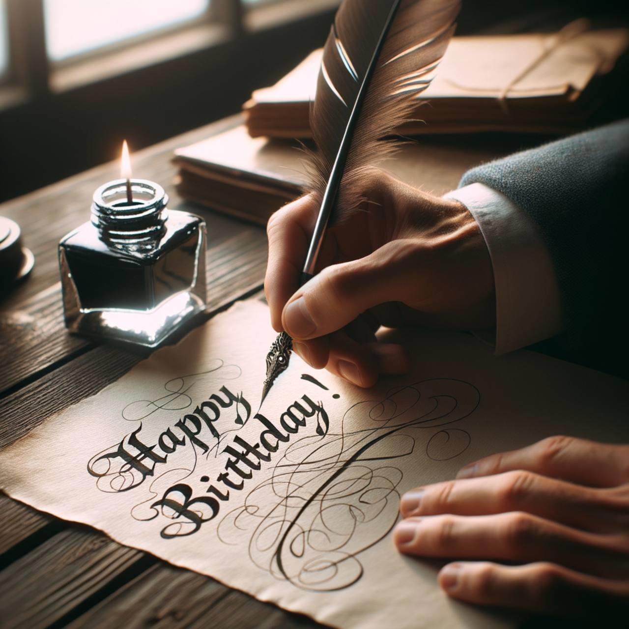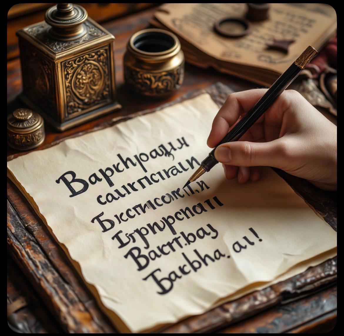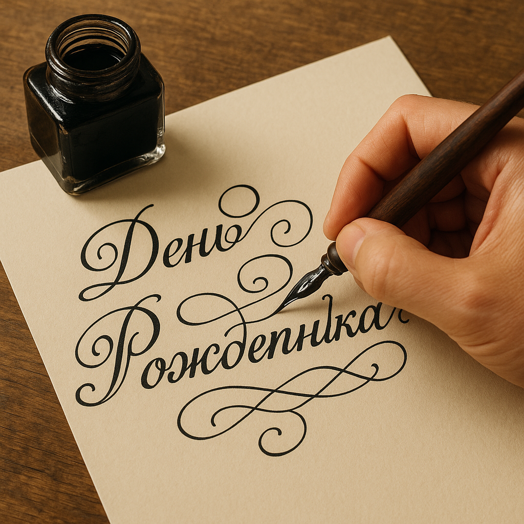 Промт был такой: Изображение, лист бумаги, рядом стоит открытая чернильница и рука с чернильным пером пишет текст витиеватым почерком, русскими буквами текст: День Рожденька!