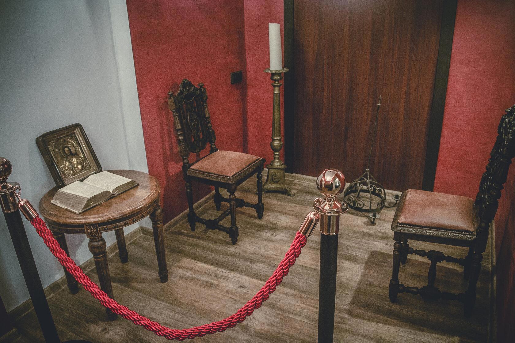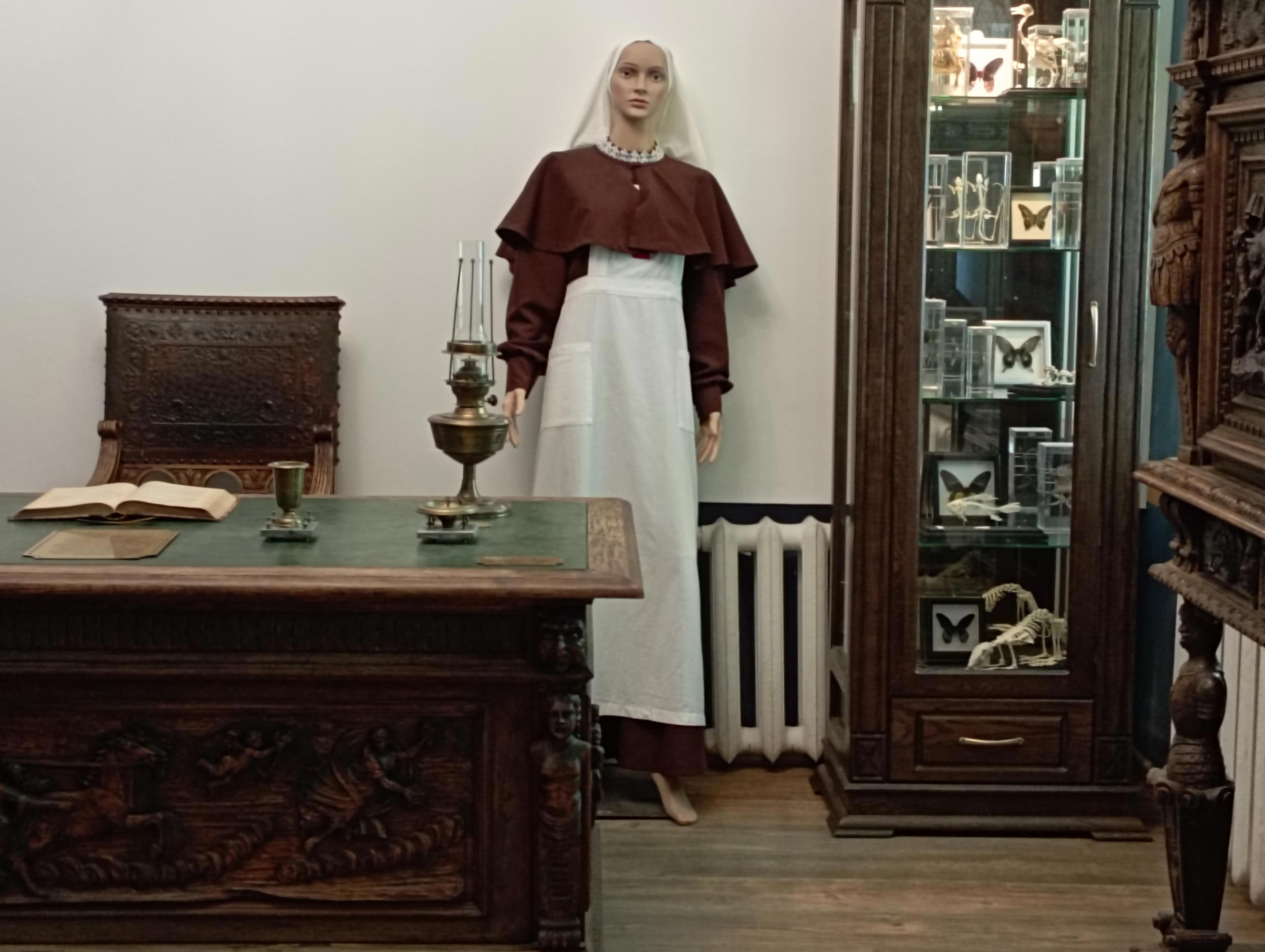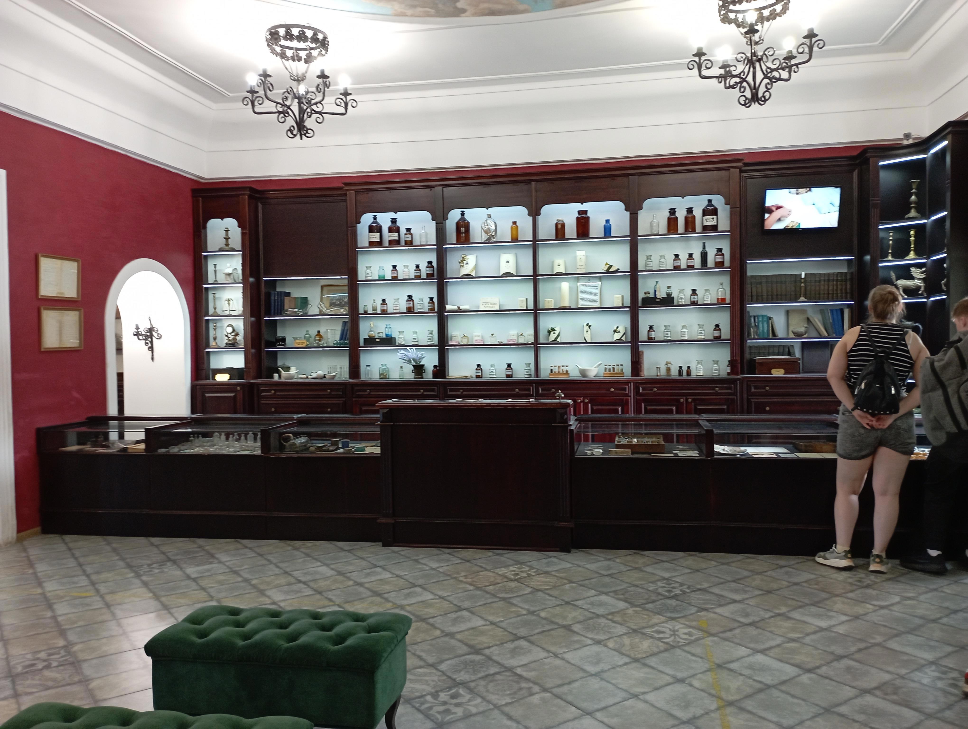 Третий зал — воссозданный кабинет провизора 19 века: монументальный стол и стул, рабочие принадлежности, платяной шкаф и многое другое. Но барышня в медицинском костюме и босиком радует отдельно :)
