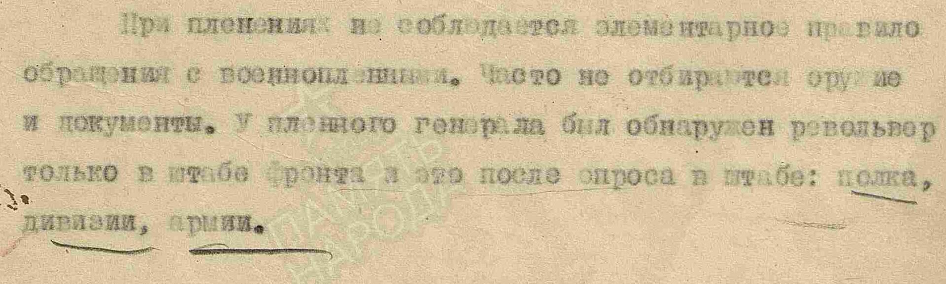 Автор: Андрей Уланов"При пленениях не соблюдается элементарное правило обращения с военнопленными. Часто не отбирается оружие и документы. У пленного генерала был обнаружен револьвер только в штабе фронта и это после опроса в штабе: полка, дивизии, армии."