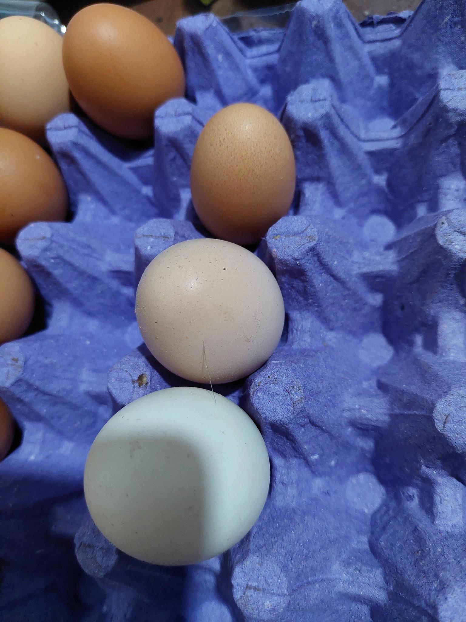 Ну и мал-мала-меньше. Молодые куры пытаются нестись. Утиное - для контраста.