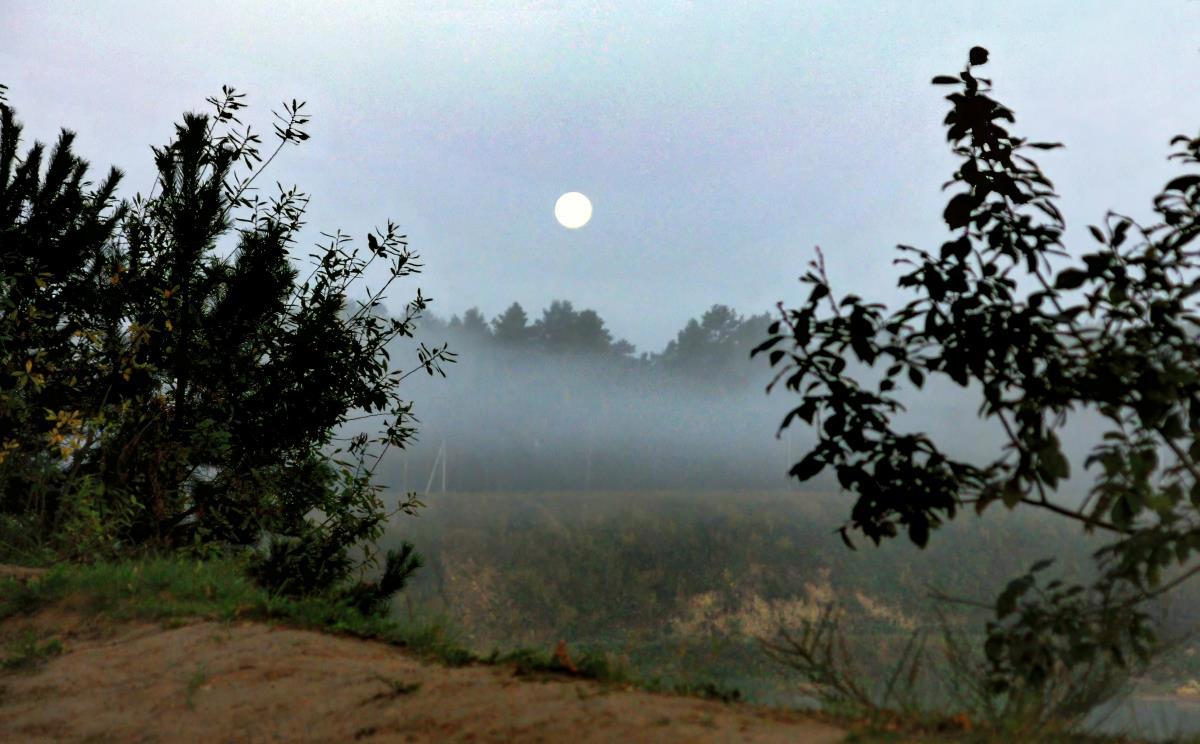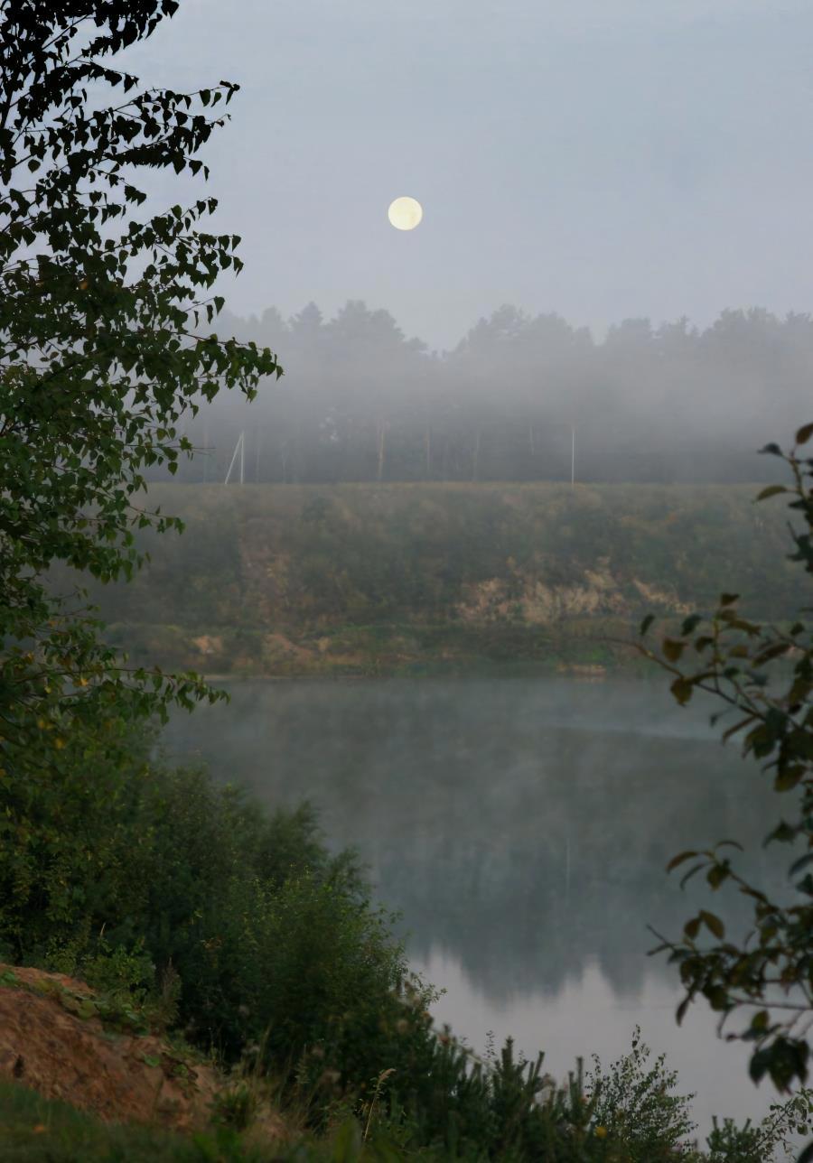 Во время затмения у нас было облачно, а вот на последней фазе облака отступили. Потом я вышла с собаками на рассвете, и видела совершенно потрясающую Луну, на ясном небе, с ярким радужным гало, но пока я возвращалась домой за камерой, гало сошло на нет. Хотя жалеть бессмысленно, всё равно этим объективом снять не получилось бы. Успела только несколько кадров тумана над карьером. И то я торопилась, нервничала, потому что там плохое место -- много дряни от туристов, и совершенно невозможно снимать и гонять щенков от помойки одновременно.