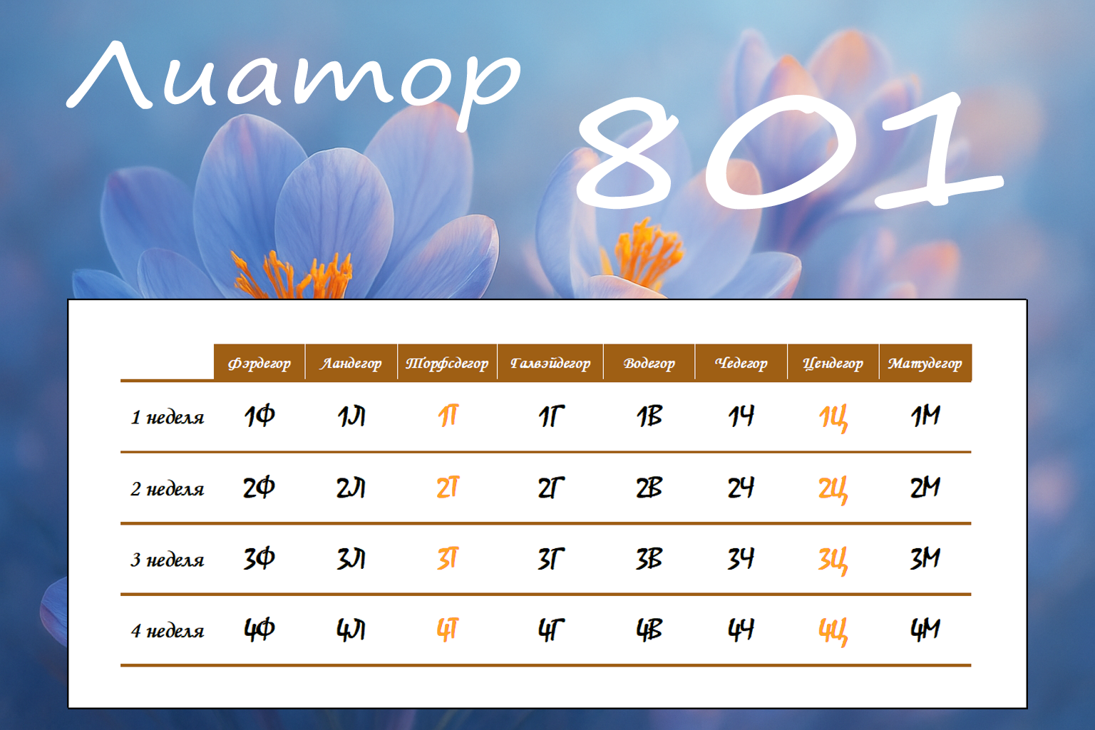 А можно и кругленький сделать и вертеть потом, как диванные войска свои непотопляемые танки. Малый круг — сезоны, средний — дни недели (здесь рукописным шрифтом должны быть красиво написаны вырвиглазные наименования), большой — дни по порядку. Только и делов, что крутить средний круг, ну и большой раз в 8 дней (или 9? говорю ж, у меня с математикой плохо). Малый — раз в сезон.
