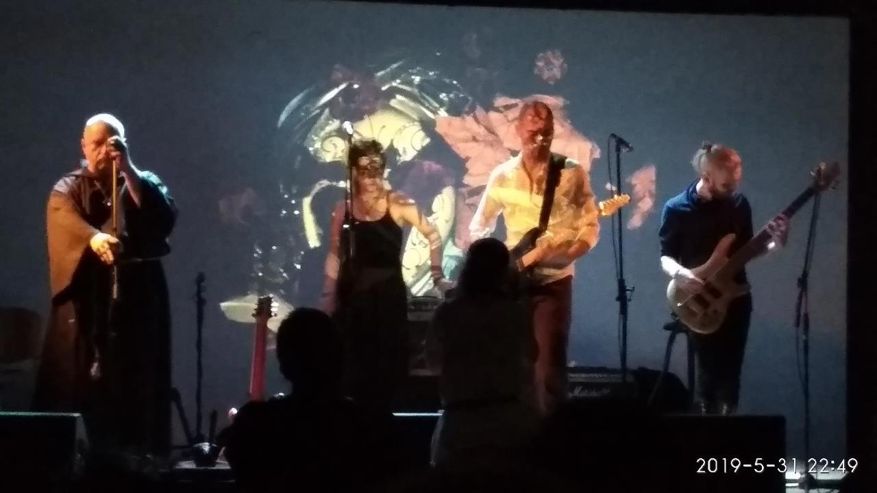 Концерт начался и был получен первый шок. Когда создатель группы, поэт и исполнитель – Михаил, сказал вступительное слово. Его речь была интересна, наполнена аллюзиями, но слова о последнем поэте Серебряного века, на котором этот век и завершился – о Маяковском, внезапно расставили всё по своим местам. На сцене творили Искусство умные и талантливые люди. Для которых философское исполнение текста и музыки стоит во главе угла (простите за тавтологию). Там творилось волшебство, священнодействие, густо приправленное аллегориями и аллюзиями, отсылающими нас от мистики христианства до мифологии Древней Греции.