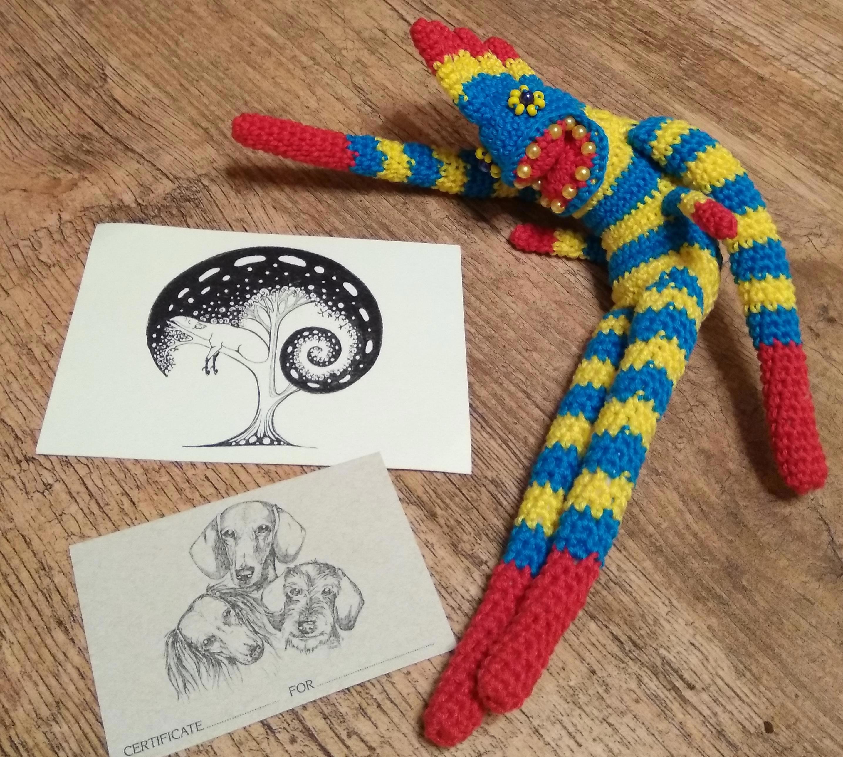 Открытка добавлена в коллекцию, а вша заняла своё место на полке с книжками и украшениями и выглядит очень довольной. Вроде прижилась)