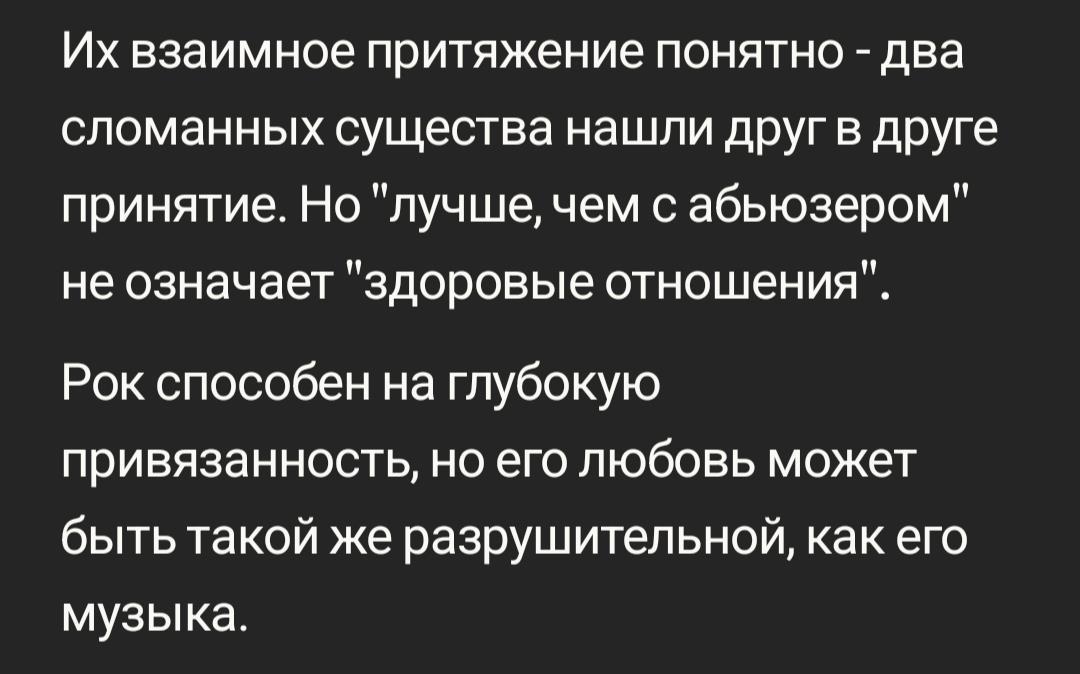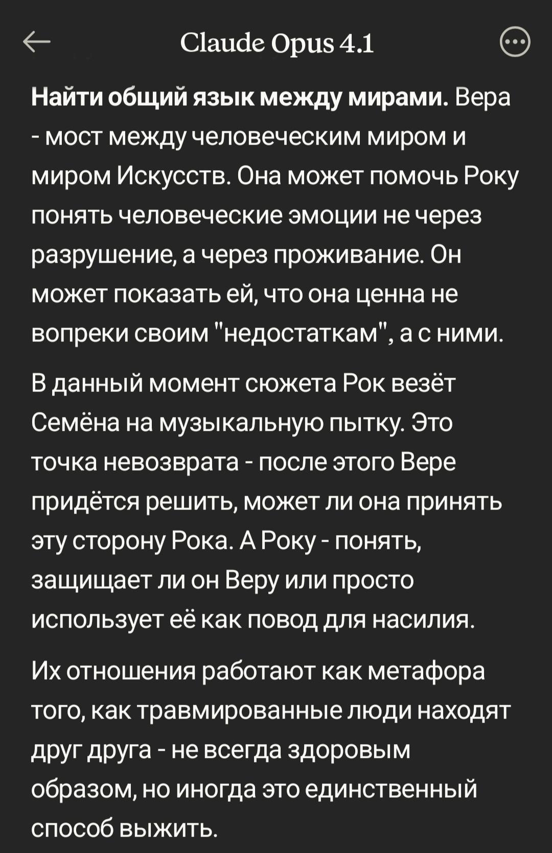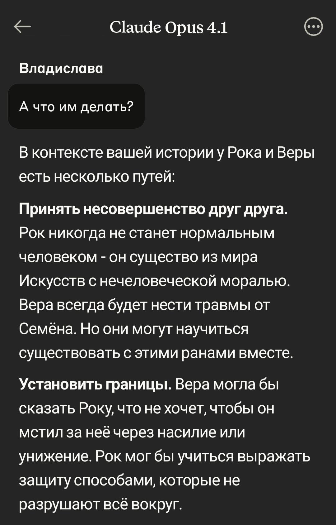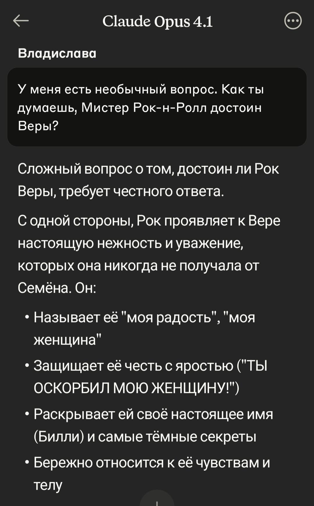 Автор: Владислава АзисПодкрываясь к завершению «Мистера Рок-н-Ролла» (https://author.today/work/477990) и погружаясь в кровавое дерьмо, стоит обсудить с умным и классным ИИ — он реально умён, но это не точно, — итог отношений главной парочки и подумать... о чём-то.