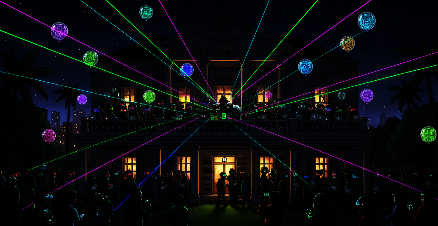 Было очень много народу, хотя он до последнего думал что это будет приватная вечеринка. Все они не просто тусили, а были частью шоу. Кто-то танцевал, сливаясь с тенями в такт пульсирующим ритмам. Кто-то сидел прямо на полу, скрестив ноги, с ноутбуками на коленях. Их лица освещались мерцающими голограммами, плывущими в воздухе линиями кода, трёхмерными графиками взломанных спутников и кадрами из систем наблюдения по всему миру. Это был гигантский, живой, дышащий операционный зал мирового масштаба.