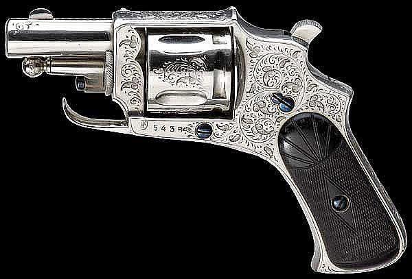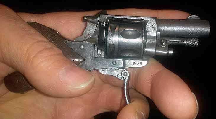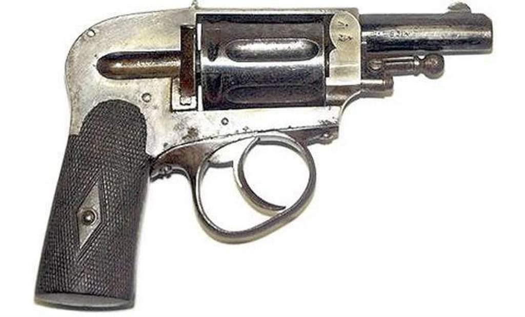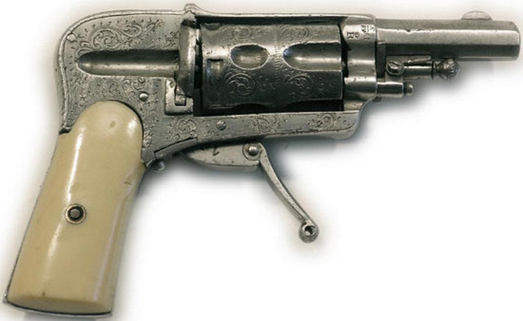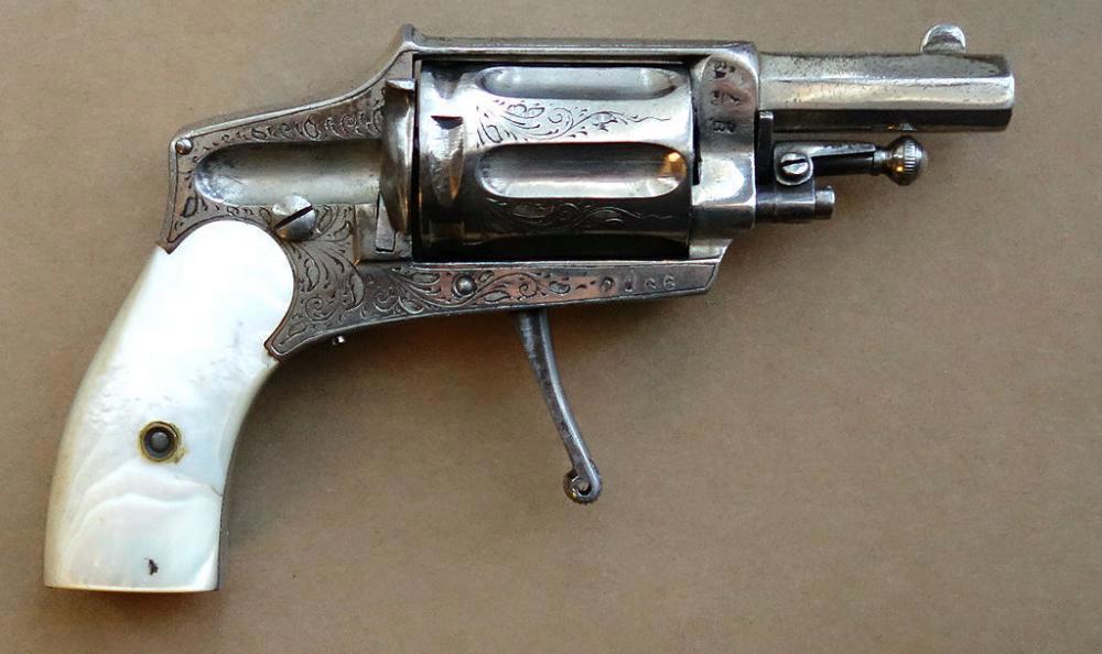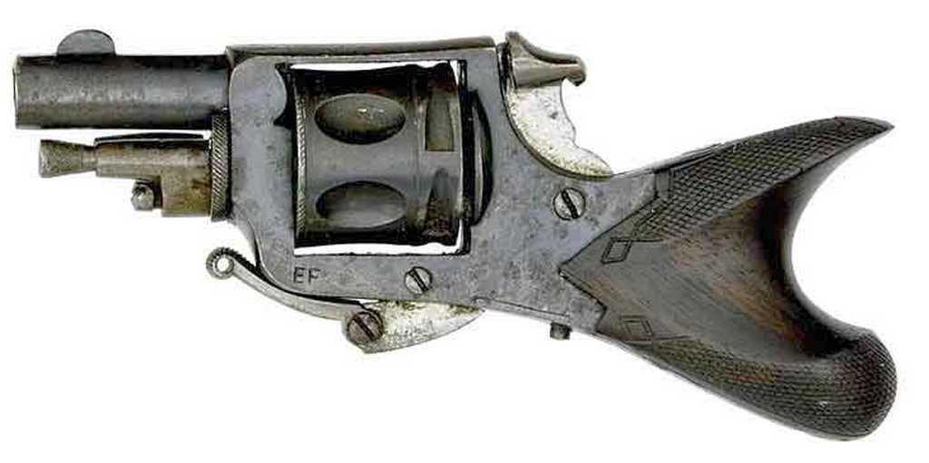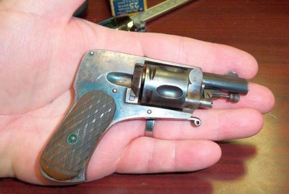Под этот патрон уже можно сделать пистолет. Он должен быть небольшим. Патронов нужно немного – не война. Но вот надёжность ему совсем не помешает. Самым надёжной стреляющей многозарядкой в конце 19 века был револьвер. Что ещё? А! Нужно, чтобы в кармане он не за что не цеплялся, да и сам карман не рвал. Поэтому торчащий курок нужно куда-то убрать. Наверное, думать дальше Галану было уже невтерпёж, поэтому он просто спрятал курок в рамку. Получилась вот такая горбатая штучка калибра 5,5 мм на пять патронов:
