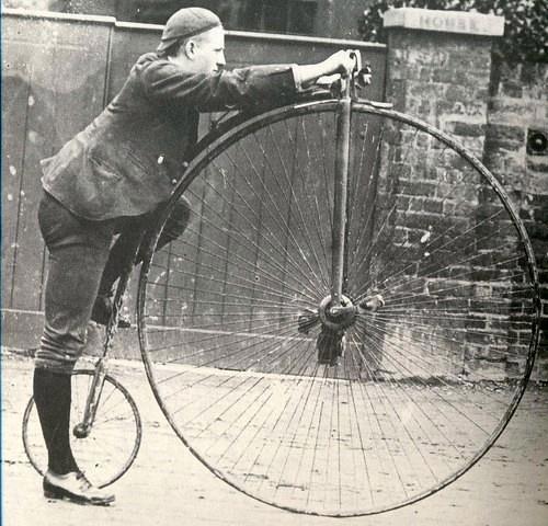 Люди быстро поняли, что эдак далеко не уехать, да и обувки не напасёшься на такое новшество. Поэтому решили обувь поберечь, а ехать побыстрее. Поэтому переднее колесо сделали большим: