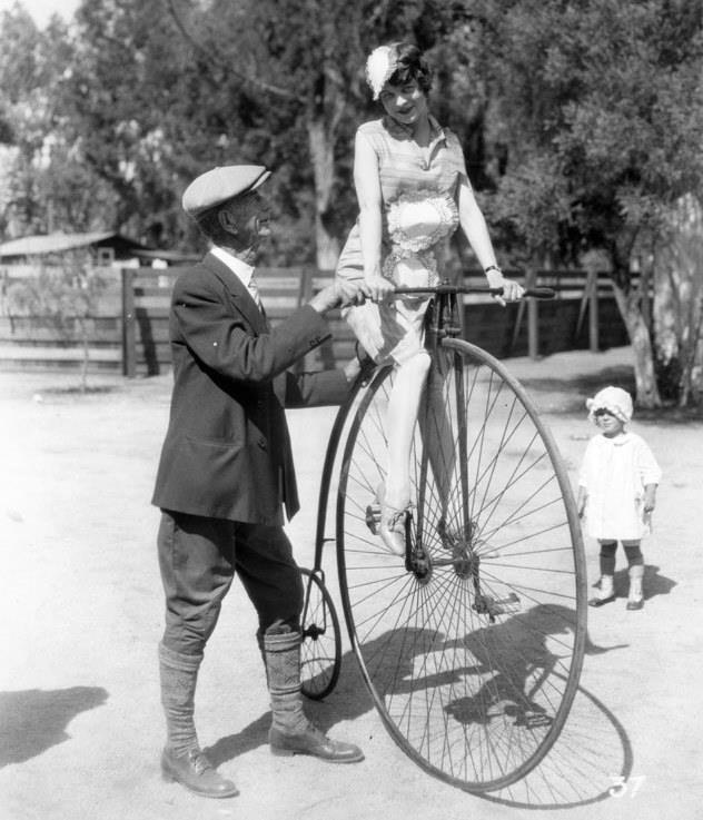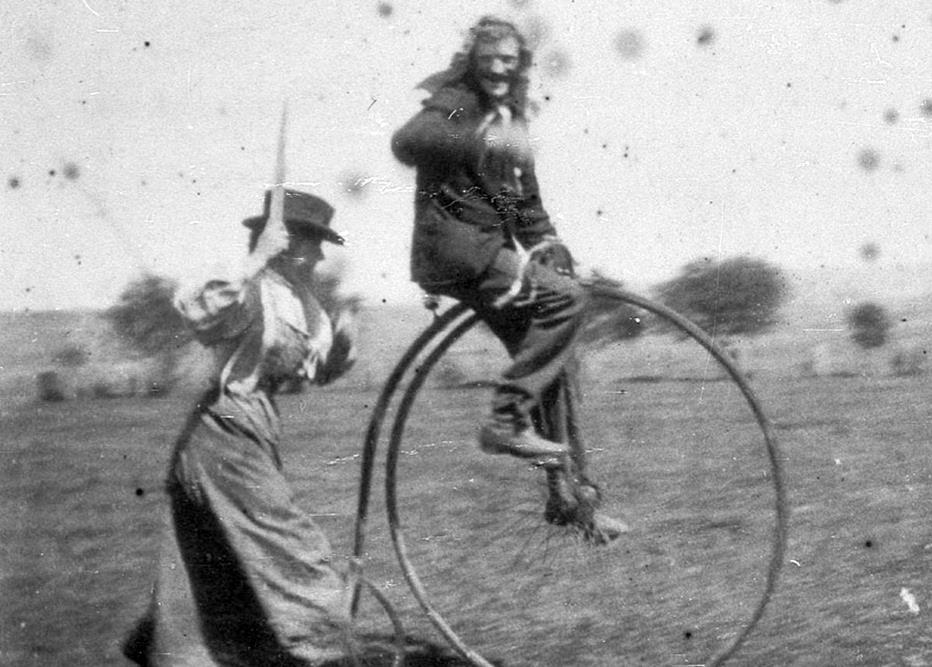 Но выглядеть модно и стильно хотелось, поэтому молодые люди с трудами не считались. Падали, вставали и снова … падали. Иногда получалось ездить. И это выглядело так изящно и красиво. Это так нравилось молодым дамам… Однако было всё же опасно и дамам сначала разрешали просто бегать за велосипедистами: