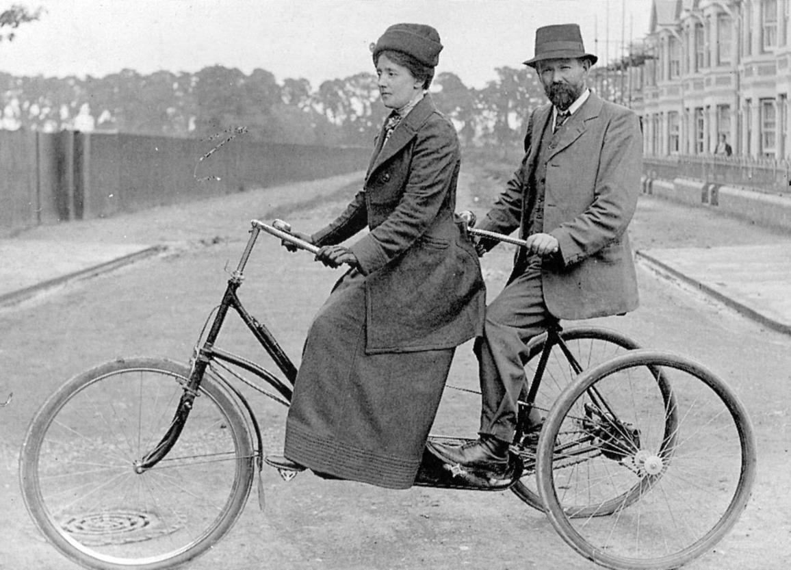 К тому времени первые велосипедисты уже стали значительно солиднее и уравновешеннее, поэтому продолжали накручивать педали уже в составе семейной идиллии: