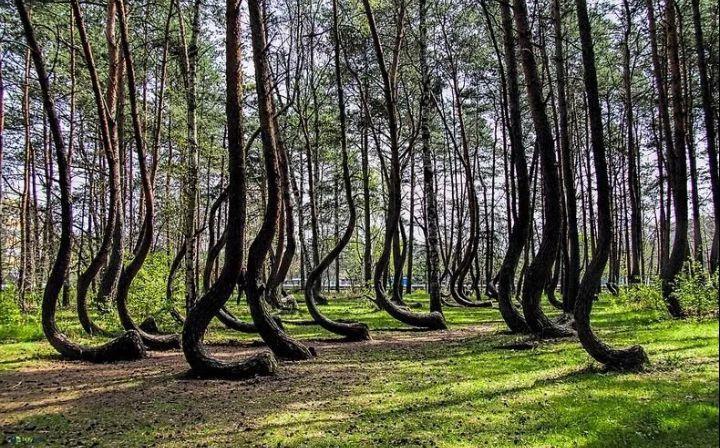 4. Лес кривых сосен в Польше – деревья растут с изогнутыми стволами в одну сторону.