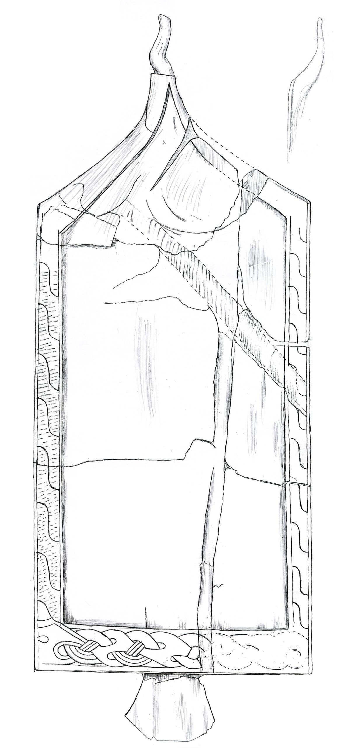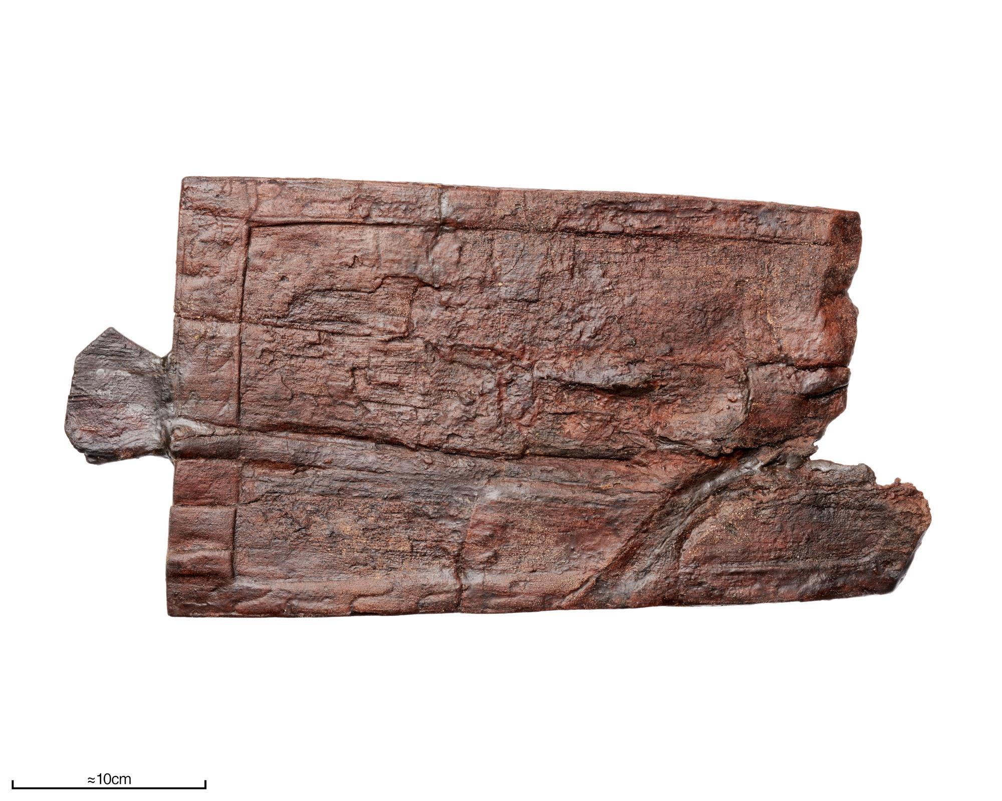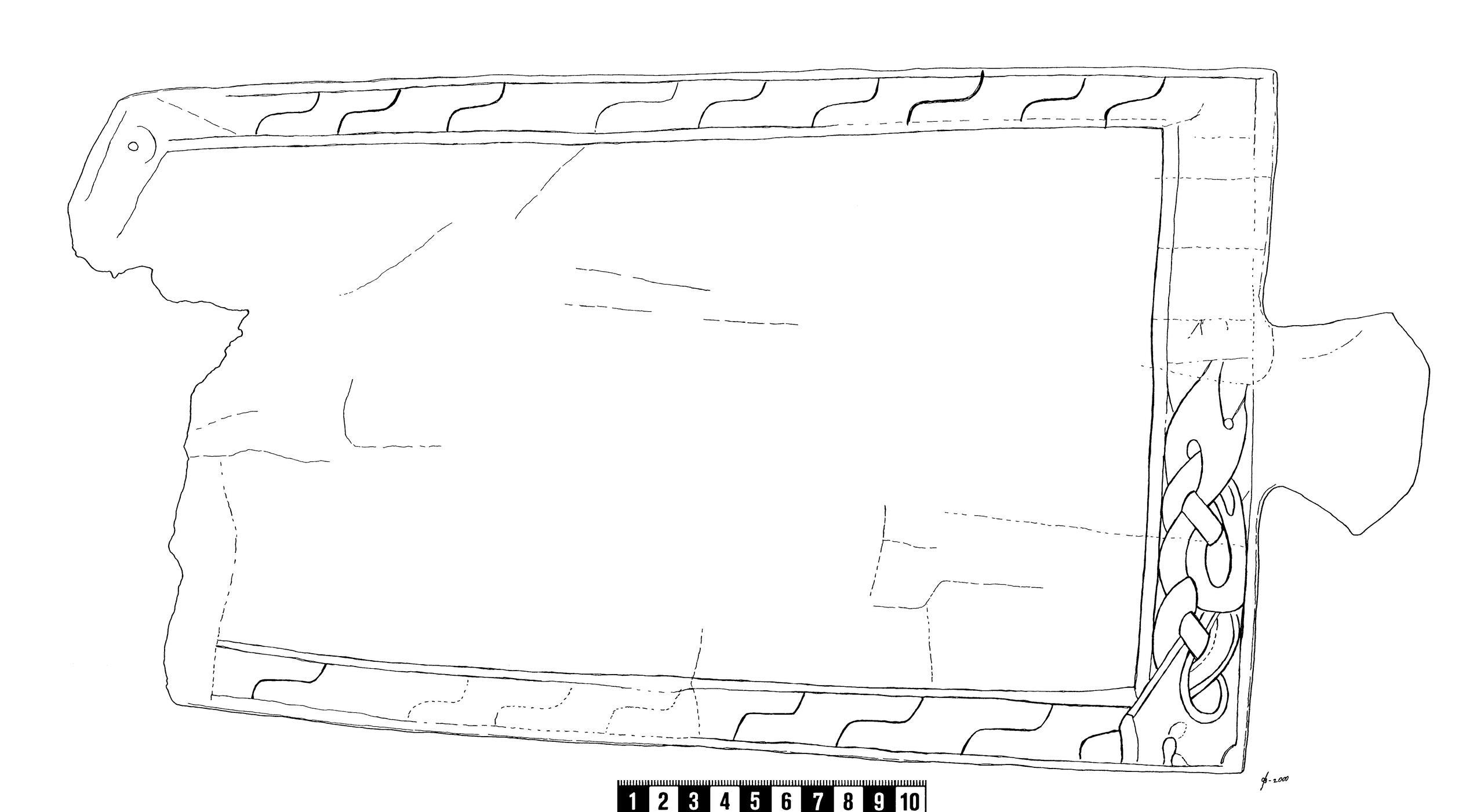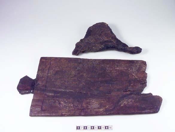 Так вот о домашней утвари. Среди разнообразного инвентаря была обнаружена орнаментированная сервировочная/разделочная доска(!) из древесины берёзы. Длина - 577 мм, ширина 220 мм, толщина 7-9 мм, толщина рукоятки - 35 мм.