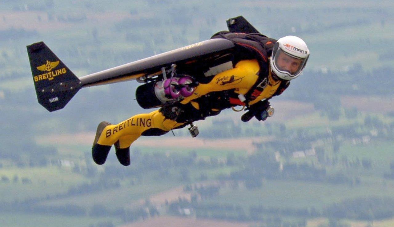 Совсем интересная, достаточно хорошо продуманная штука сделана изобретателем из Швейцарии (вот уж от кого не ждал!) по имени Ив Росси (Yves Rossy). Правда с размерами у него получилось не очень, но по части продуманности прям лучше всех. Уже прошли первые испытания по взлёту с земли. Насколько устройство «Jetman» можно назвать «реактивным ранцем» сами судите: