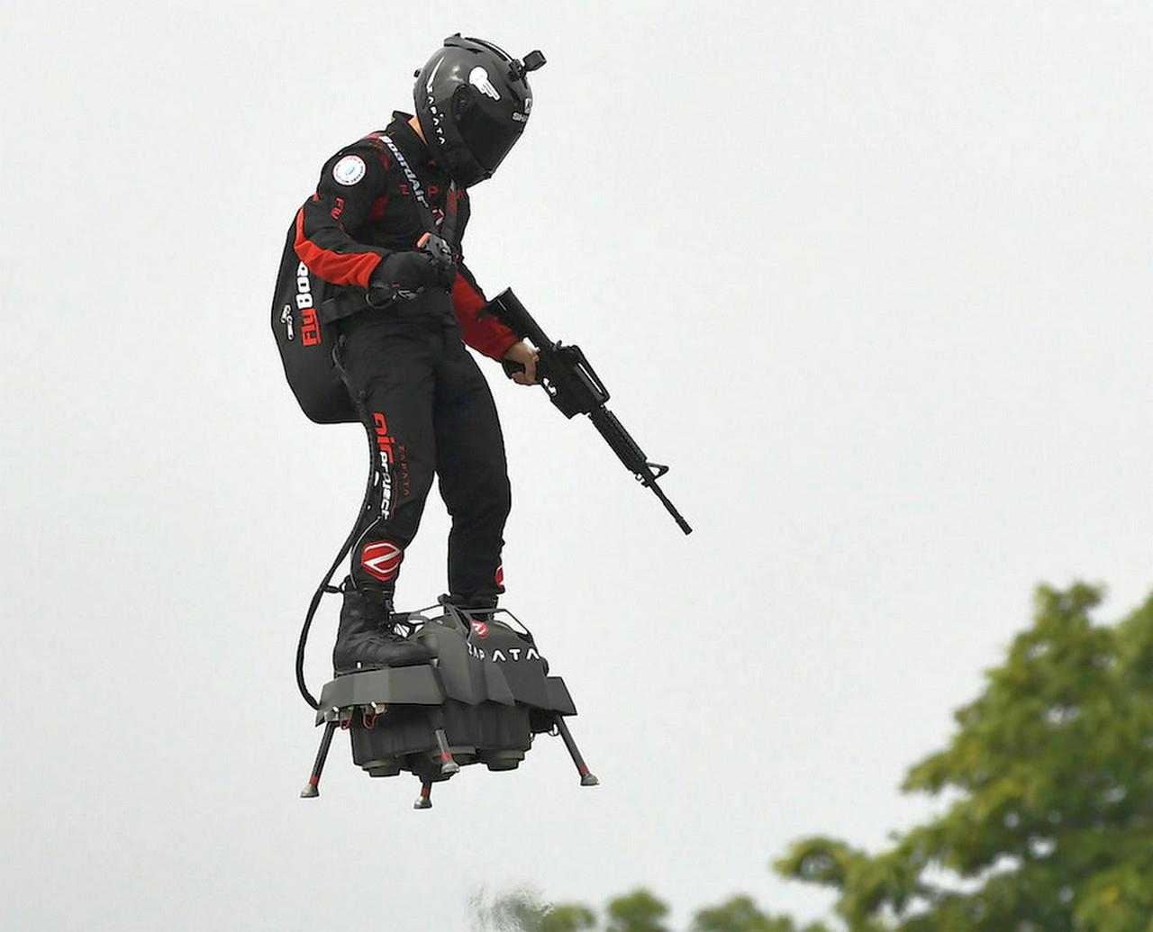 Немного иначе подошёл к проблеме личного летательного аппарата создатель «Flyboard Air» (Летающей доски) Фрэнк Запаты (Franky Zapata). Ранцы он посчитал неудобными и предложил просто стоять на реактивных двигателях. Однако и он не удержался от «стандарта» и едва показав своё изобретение на публике, сразу взял в руки автоматическую винтовку: