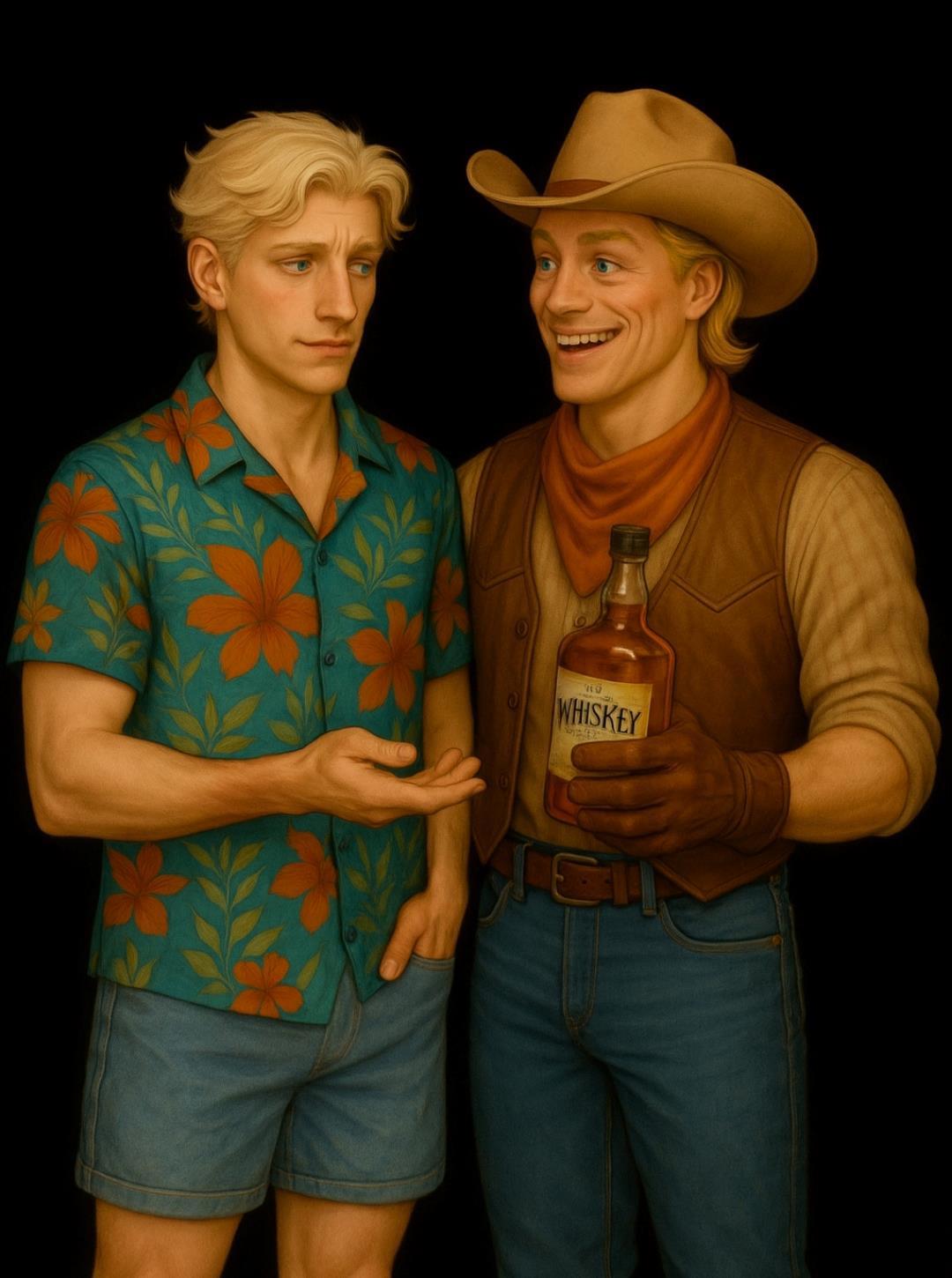 Второе комбо — Мистер Кантри и Хранитель Солнца (о да, он в гавайской рубашке). Оба несут в себе мотив света и позитива, оба светловолосые и голубоглазые, оба алкаши. И мне кажется, если они увидят дружбу товарищей выше, то начнут пить ещё больше (от горя).