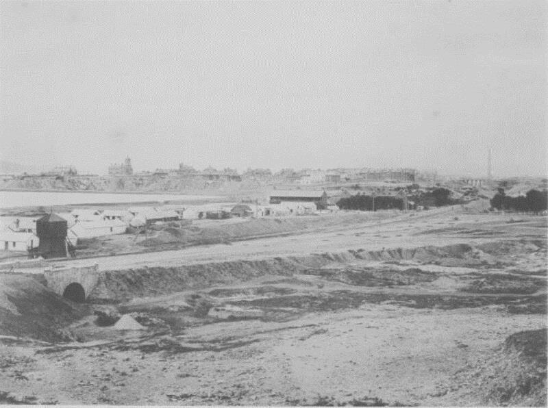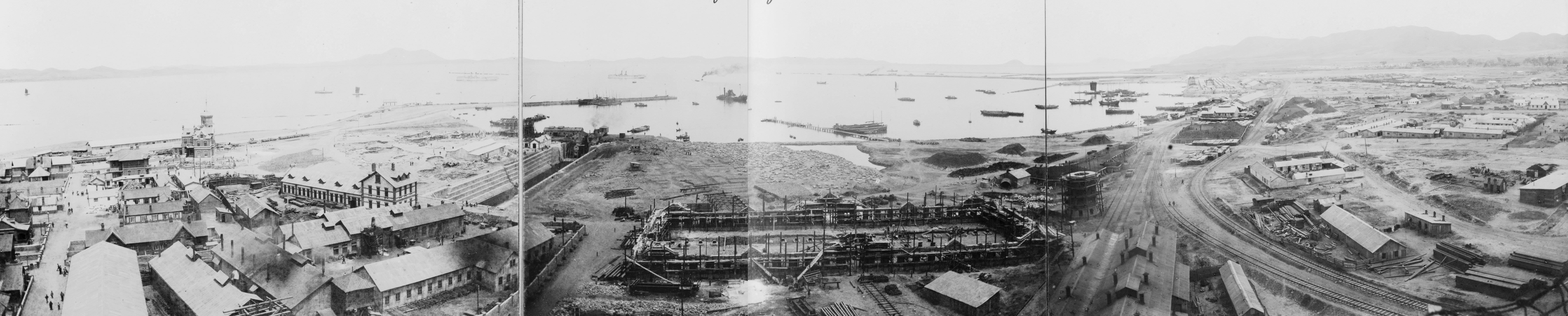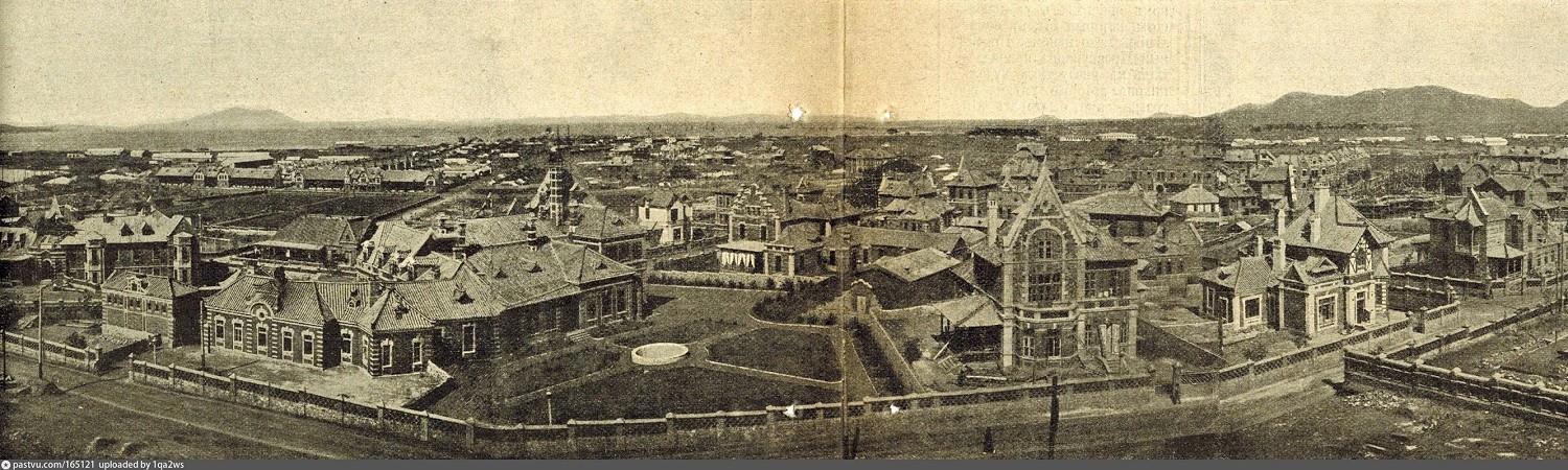 Панорама русского Дальнего. В период его строительства. В левом нижнем углу можно видитеть знание портовой конторы. Выше него на противоположном берегу видна гора Самсон.