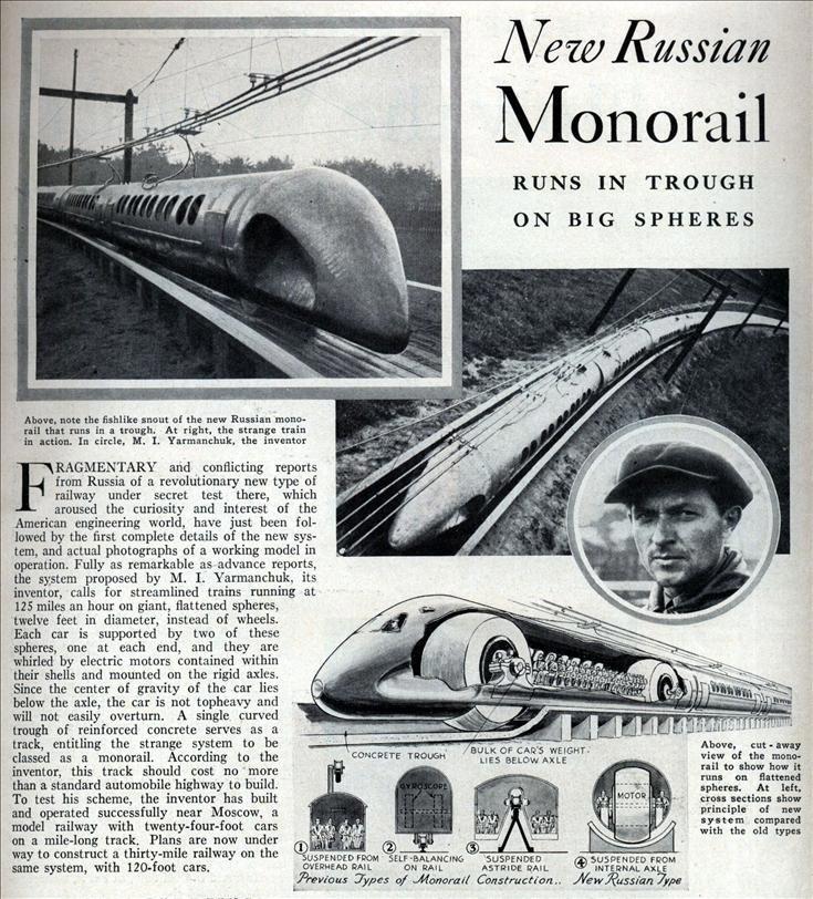 Поезда такие предлагал Ярмольчук в начале тридцатых годов и их даже вроде и собирались строить, но потом отказались. Ярмольчук правда не успокоился и продолжал их рекламировать, но всерьез уже это никто не рассматривал. Но вот в фантастике эти поезда все же поехали.