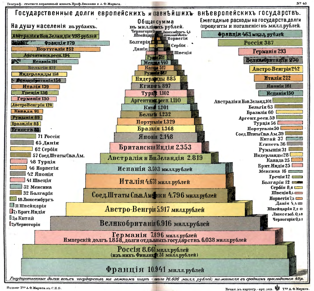 Как видим долг России был на уровне остальных ведущих держав мира. И кстати Россия представлена с долгами даже Финляндии, а остальные страны без долгов своих колоний.