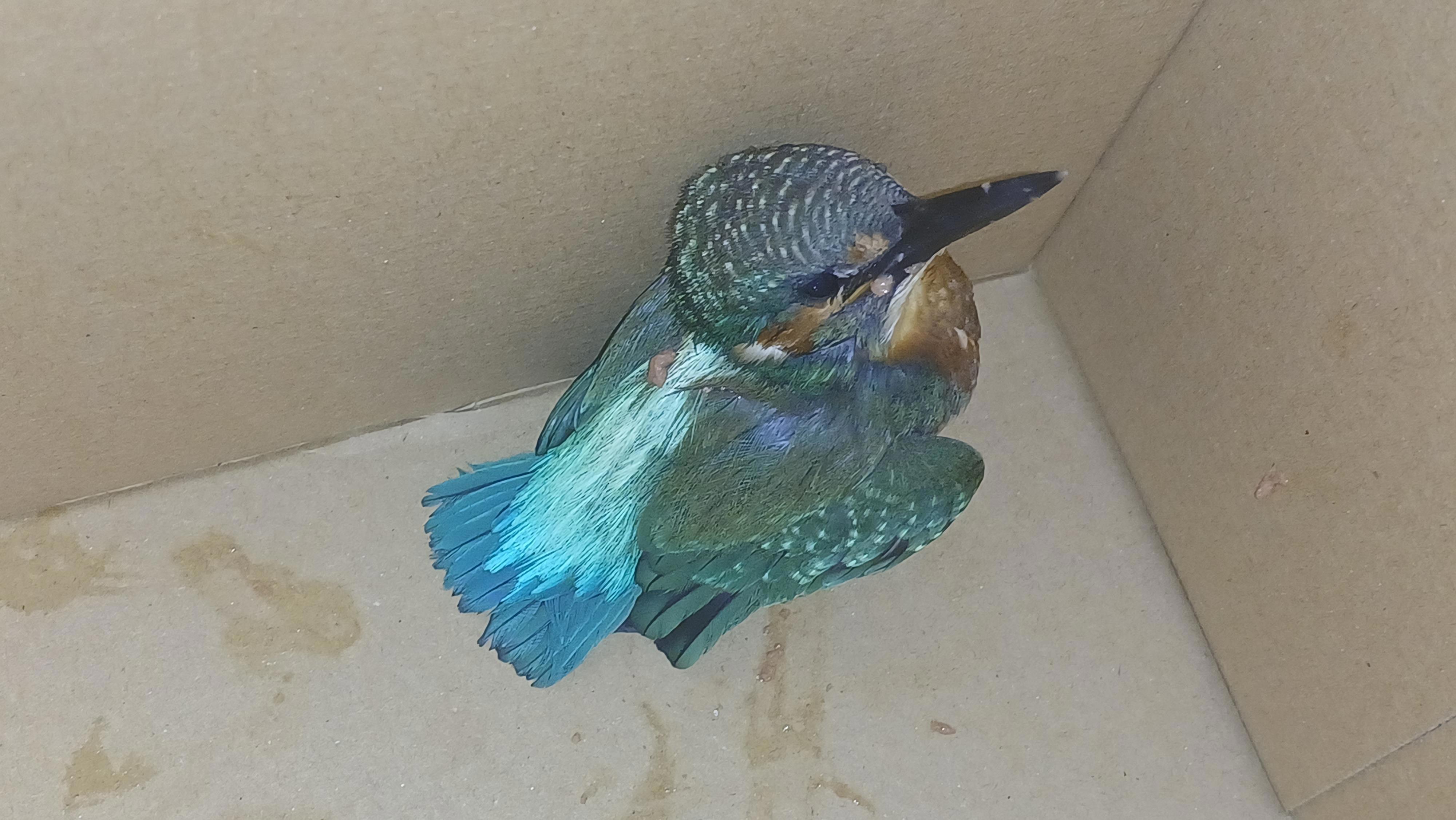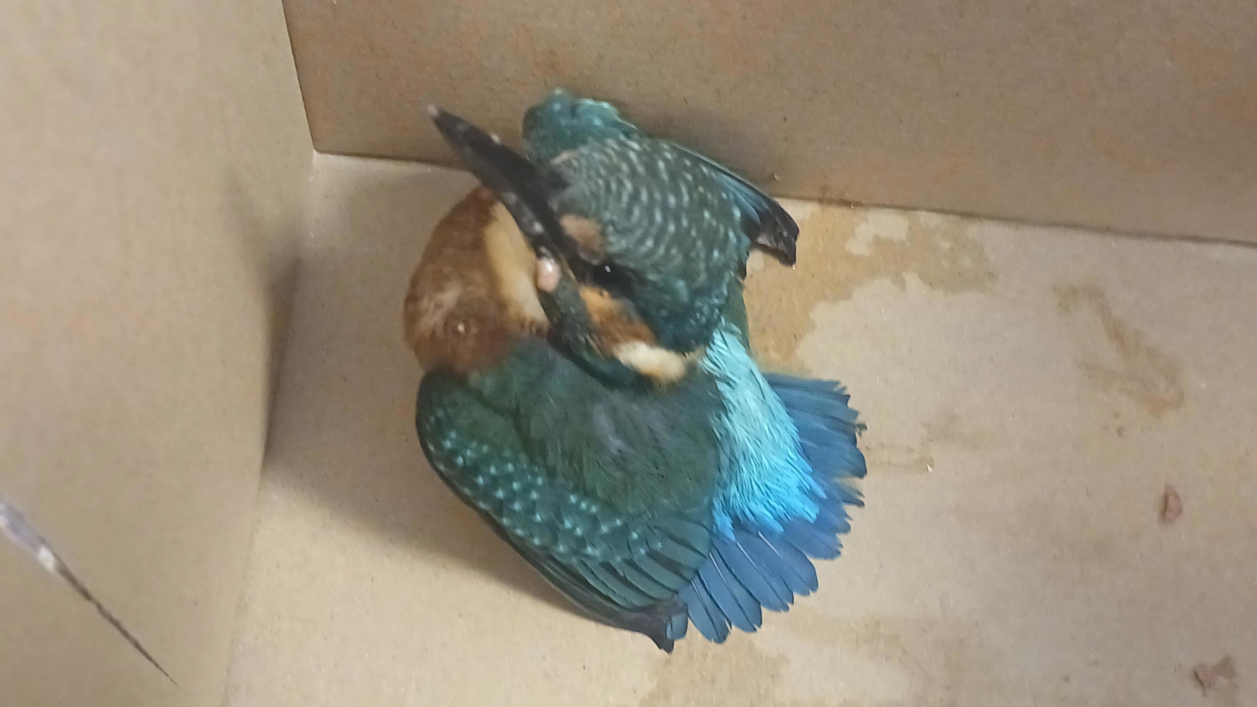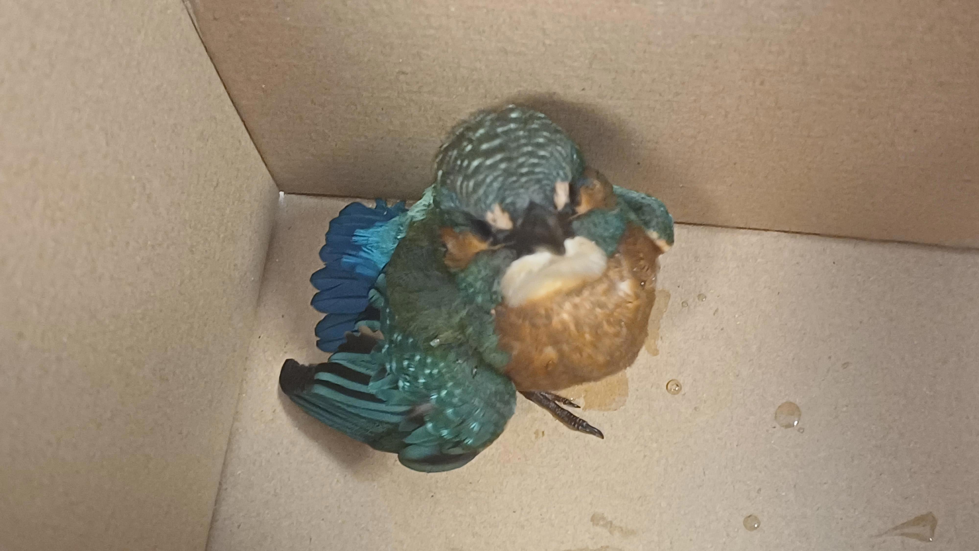 Зимородок. Не мог летать. Спасли от кошек и пытаемся кормить.
