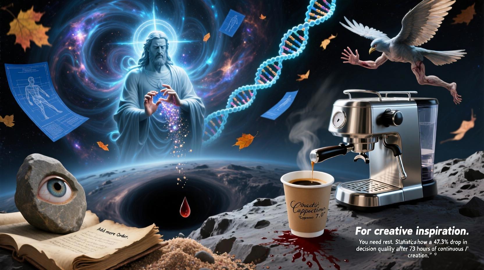 Словно в ответ на мои мысли, из завихрения хаоса материализовалась знакомая блестящая форма. Моя кофемашина. Она молча проехала пару метров на своём хромированном корпусе, щёлкнула клапанами и выплюнула на ближайший астероид идеально крепкий эспрессо в бумажном стаканчике. На боку стаканчика было выведено: «Для творческого подъёма. С уважением, Ваш „Капучино 7.0“».