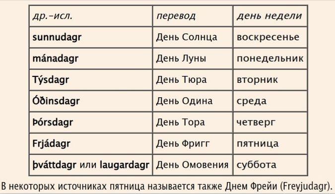 Четыре дня из семи были посвящены языческим богам — Тюру, Одину, Тору и Фрейе (либо Фригг), воскресенье и понедельник — солнцу и луне, а суббота — мытью и стирке. Однако в XII веке хоуларский епископ Йоун Эгмундарсон запретил посвящать древним богам и богиням дни недели.