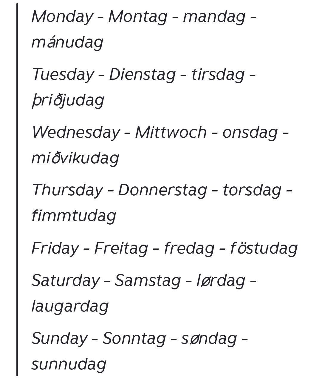 Сегодня дни недели в германских языках — английский, немецкий, норвежский и тот же исландский выбраны для иллюстрации — называются так: