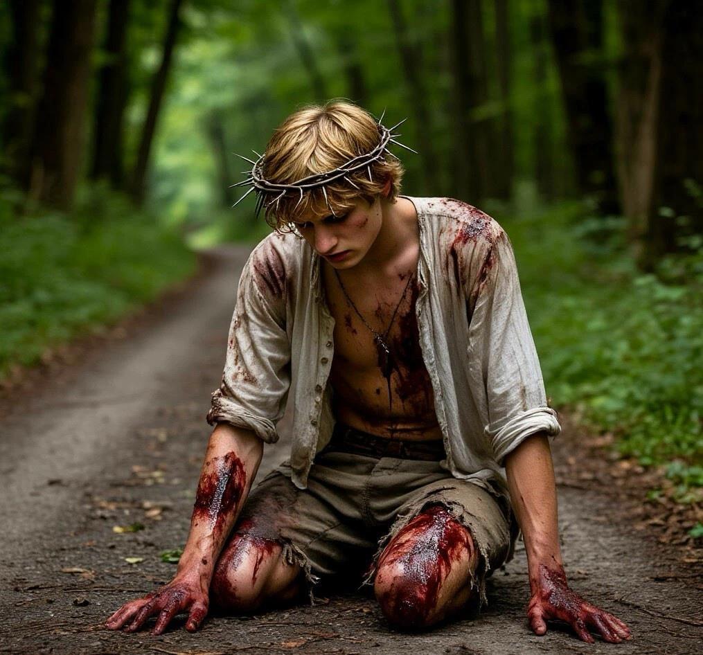 Он упал на колени, весь кнутами засечен -