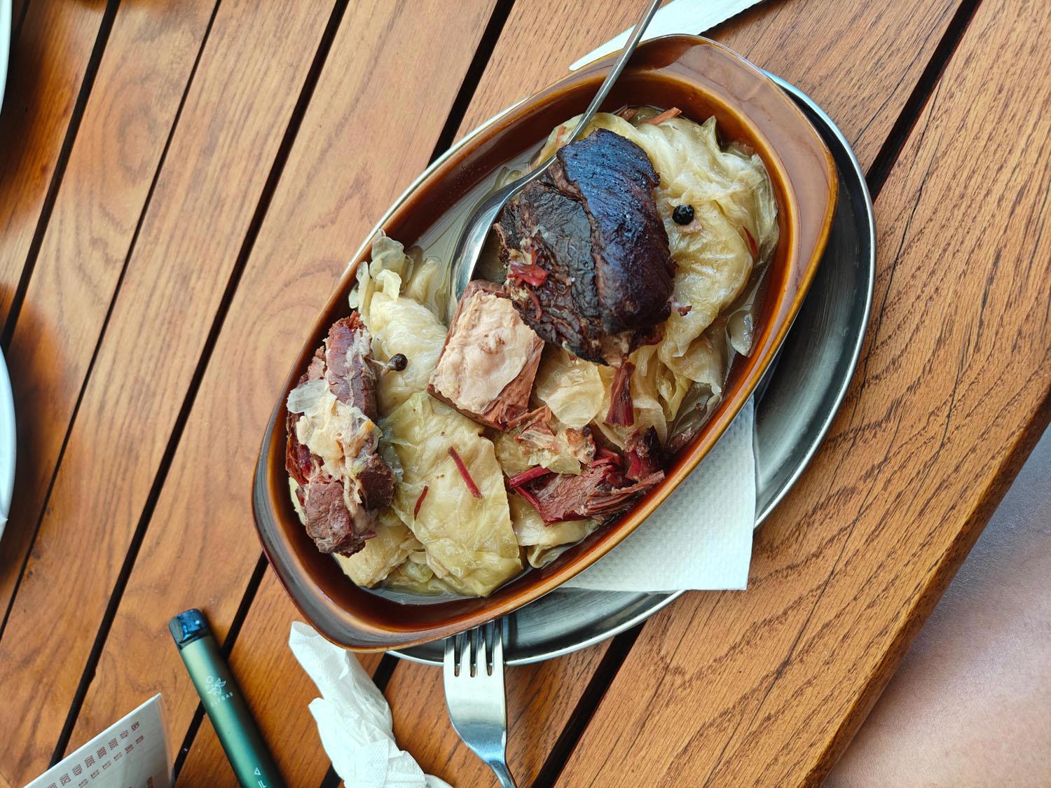 Свадебное или праздничное блюдо, тушеная или томленая капуста в сочетании с несколькими сортами мяса (говядина, баранина, рулька, бекон, копчения), уложенных слоями.