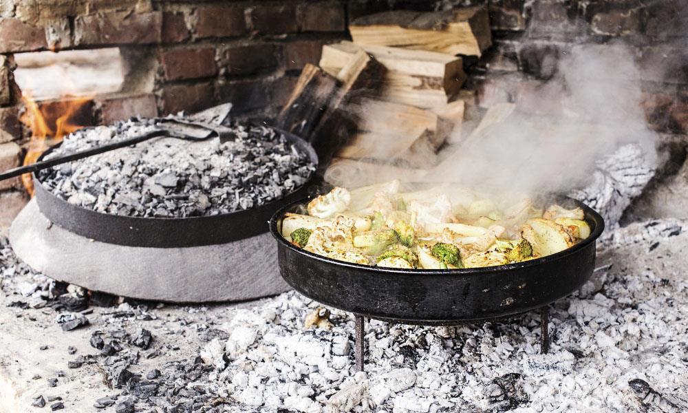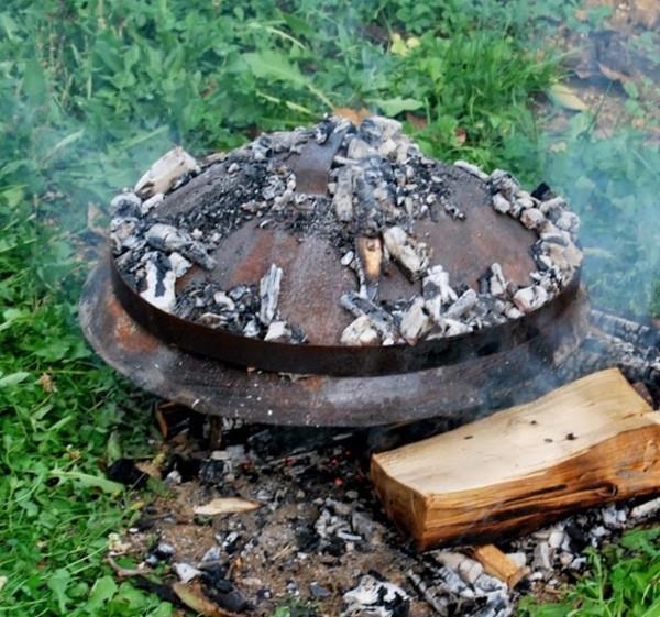 Томленое на углях телячье мясо. Весь фокус в саче — тяжелой куполообразной крышке с обручем (встроенным или накладным). Посудину с мясом ставят на угли, накрывают сачем, а сверху валят еще углей, которым не дает рассыпаться обруч. Получается исключительно нежное мясо.