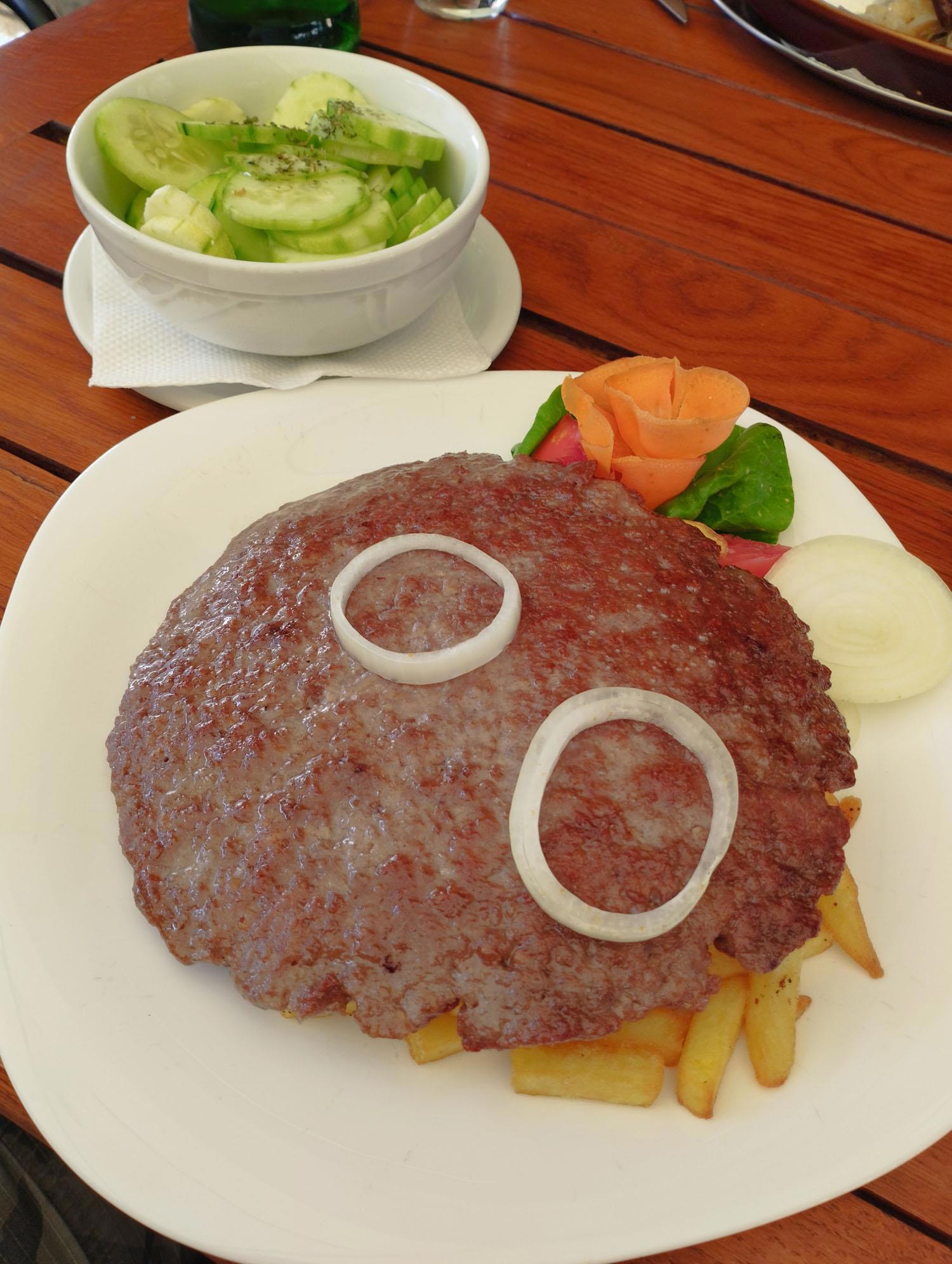 Громадная котлета, в варианте «гурманска плескавица» еще больше, чем обычная плескавица. Есть еще фаршированная плескавица — это чтобы едок гарантированно не смог подняться из-за стола.