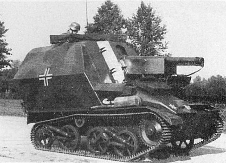 Давайте же посмотрим, что там в замке у шефа? В цитатах ниже идёт речь о боевом применении G.Pz. Mk. VI (e) - немецких самоходных 105-мм гаубиц на базе трофейных британских Mk.VI. Вот такие вот агрегаты: