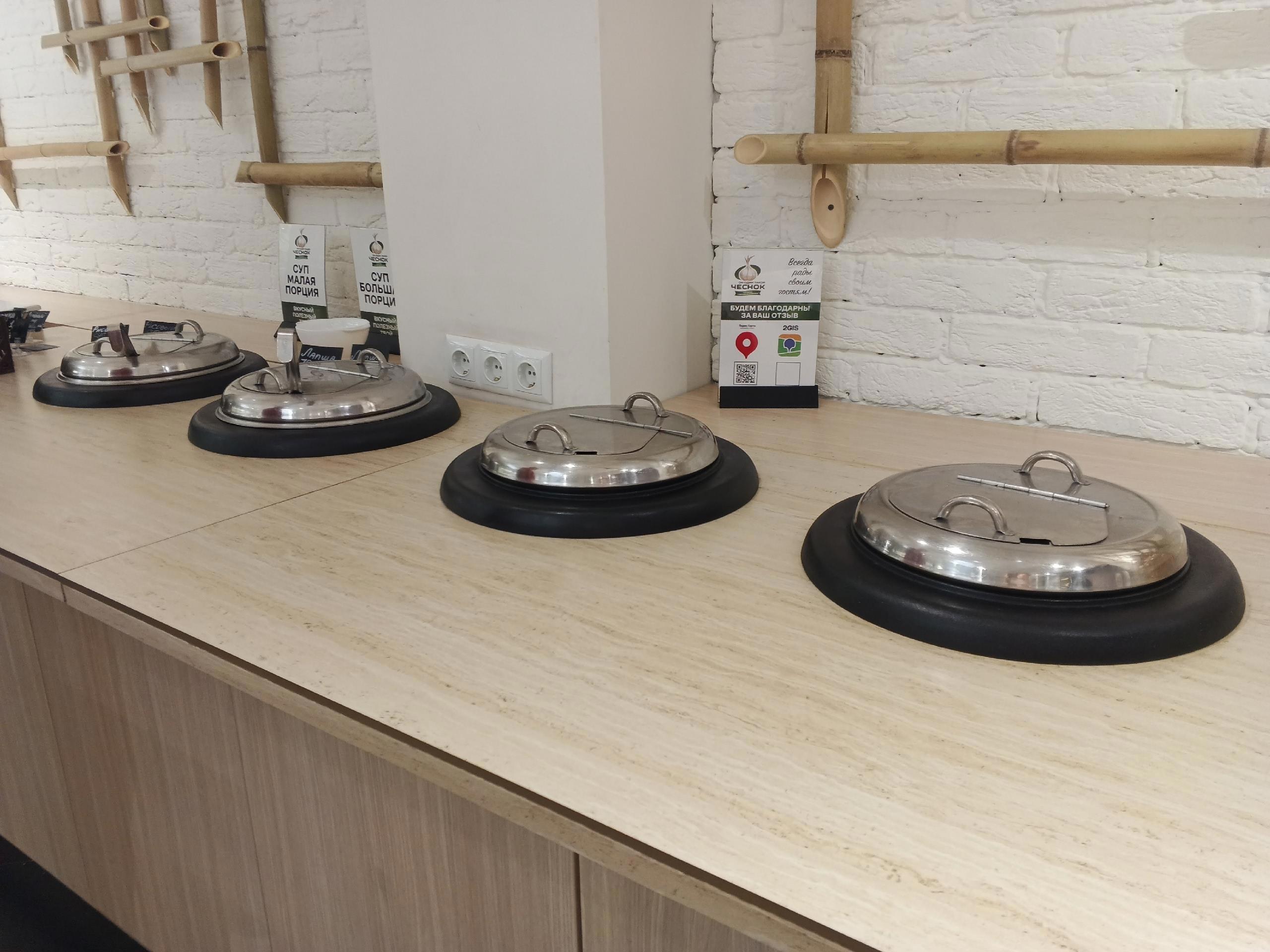 Сразу напротив салатного островка, стойка с самоподогревающимися супами.