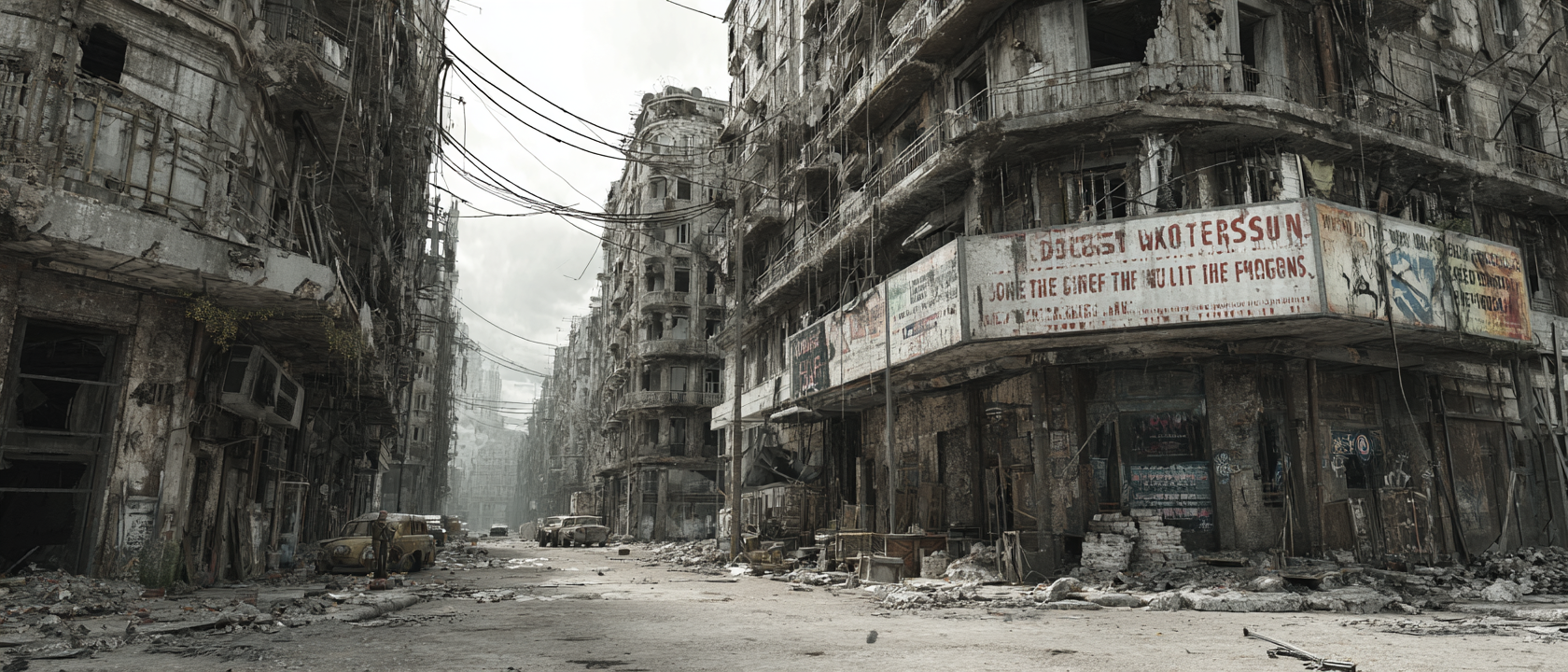 Дома стояли, как гробницы. Стёкла — выбиты. Балконы — осыпались. Витрины магазинов зияли, как рты выброшенных на берег рыб. Над головами свисали оборванные провода, напоминавшие обугленные лозы. На стенах виднелись следы копоти, отпечатки ладоней, выцветшие агитационные плакаты предвоенной поры.