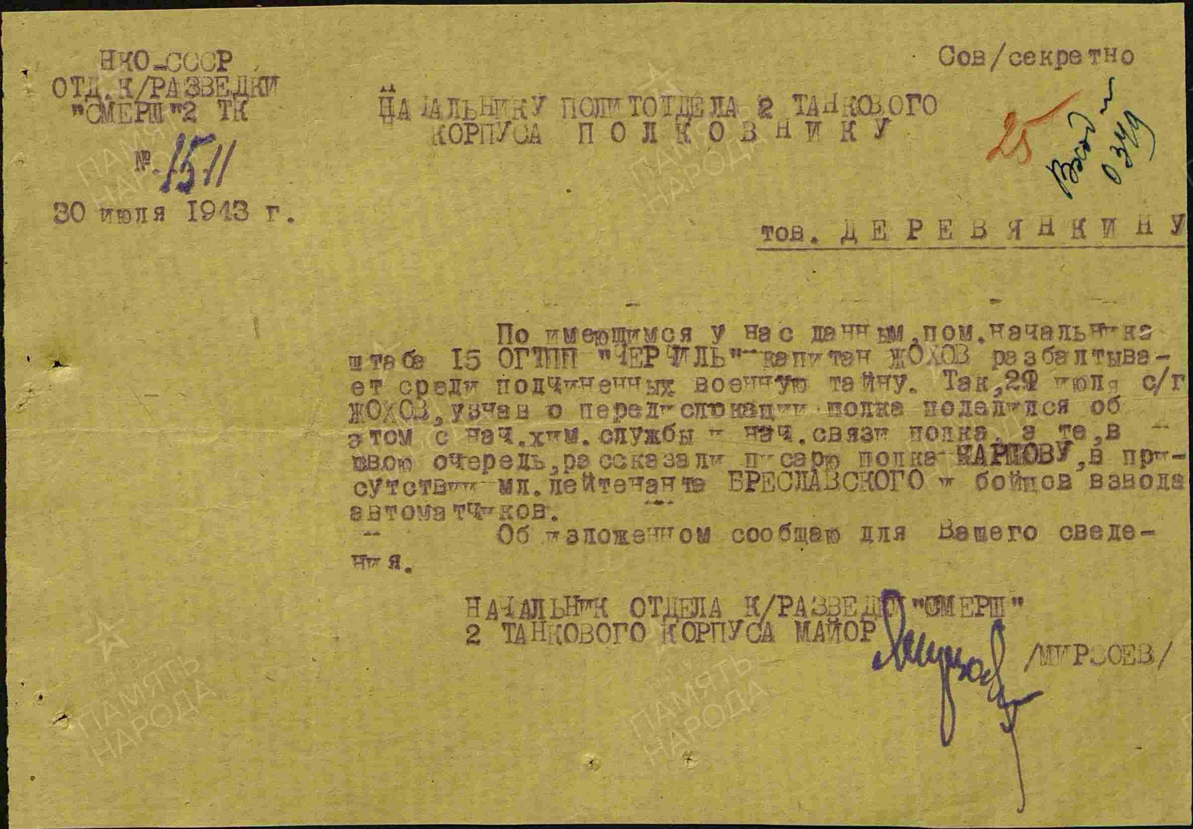 По имеющимся у нас данным пом. начальника штаба 15 ОГПП "ЧЕРЧИЛЛЬ" капитан ЖОХОВ разбалтывает среди подчинённых военную тайну. Тан. 29 июля с/г ЖОХОВ, узнав о предстоящей передислокаци полка, поделился об