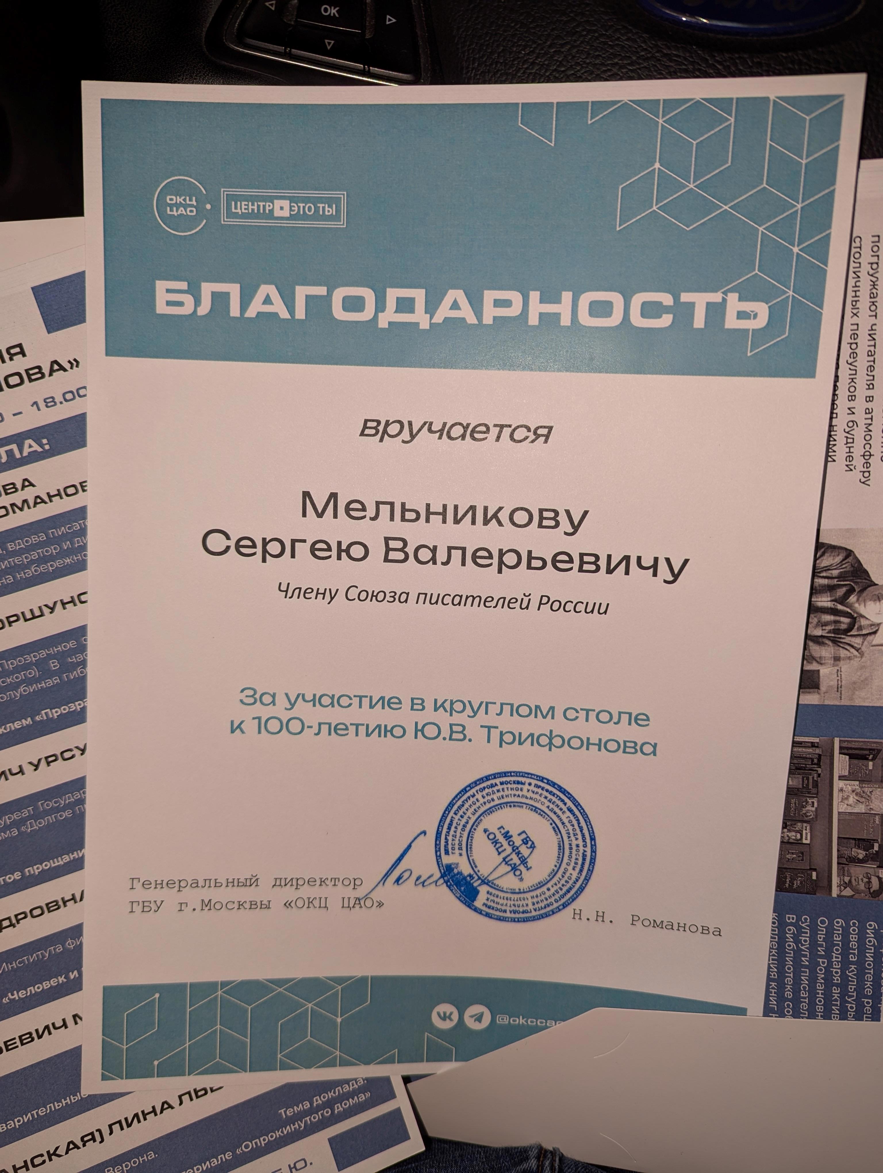 На Чаянова, 8 я примчался вовремя. Сел на своё место с табличкой «Сергей Валерьевич Мельников, член Союза писателей России». Через одно место от меня сидел режиссёр Сергей Урсуляк. Его «Долгое прощание» и «Тихий Дон» мы смотрели недавно, а сериал «Ликвидация» один из моих любимых (надо пересмотреть). Потом между нами заняла своё место профессор Людмила Александровна Трубина, завкафедрой литературы XX-XXI вв Института филологии. Чуть позже появились главный режиссёр театра «Сфера» Александр Коршунов (жена сразу вспомнила милиционера из фильма «Не могу сказать прощай») и Лина Каццола, преподаватель русского языка и литературы из Университета Вероны. Ольга Романовна Трифонова собиралась, но не смогла прийти — здоровье.