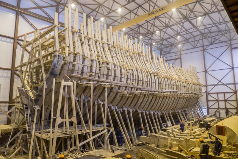 15 июня 2011 на Павловском заводе торжественно установили закладную доску будущего парусника. Деревянная часть корабля воссоздавалась по акварели Питера Бергмана, написанной в 1700 году. Со слов конструктора надстройки Александра Тихомирова, для её строительства использовались те же материалы, из которых строили и оригинальный корабль: сосна и дуб, причём возрастом не меньше 100 лет.