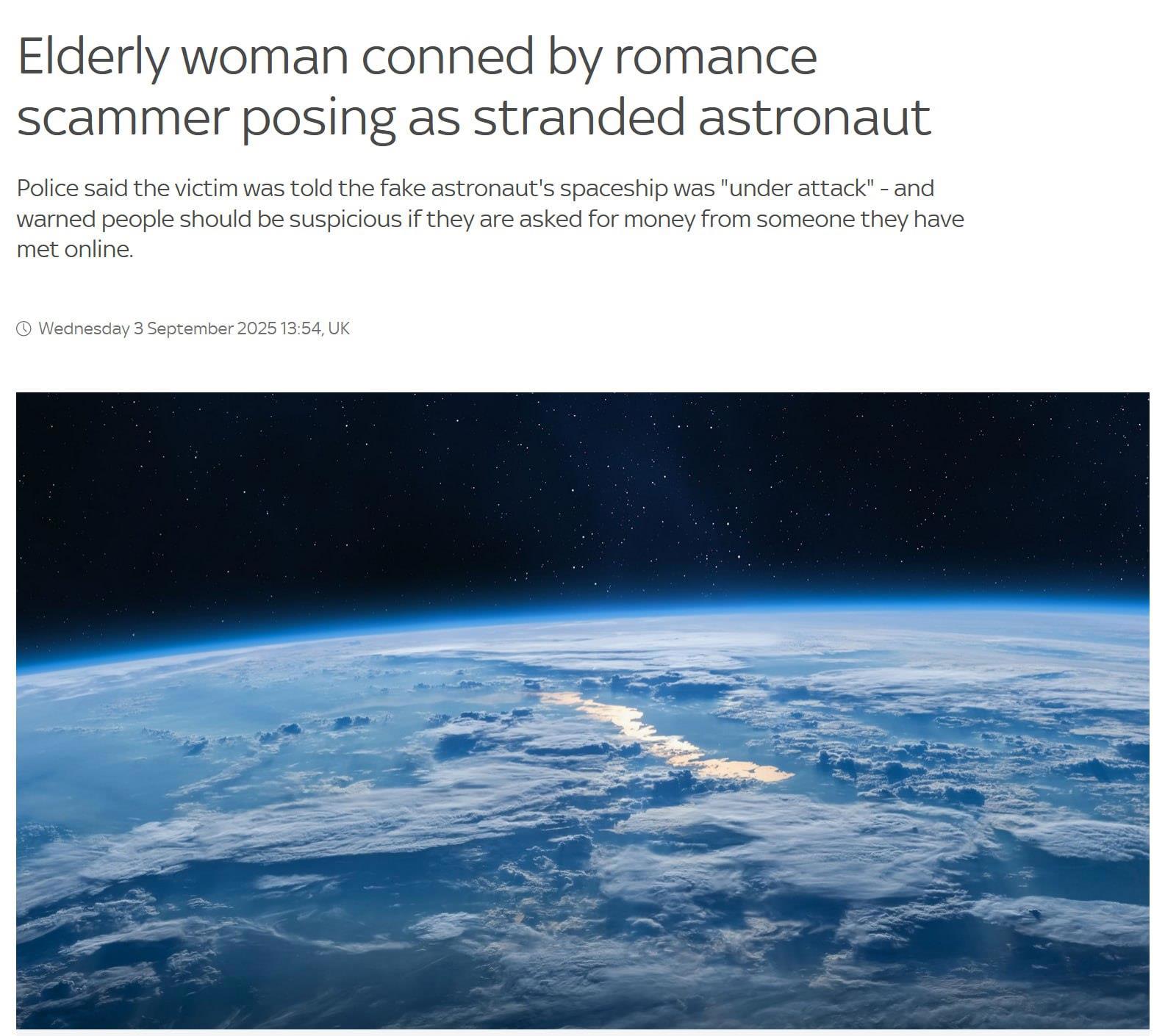 Он ей пожаловался, что застрял на орбите и ему нужны деньги на покупку кислорода.