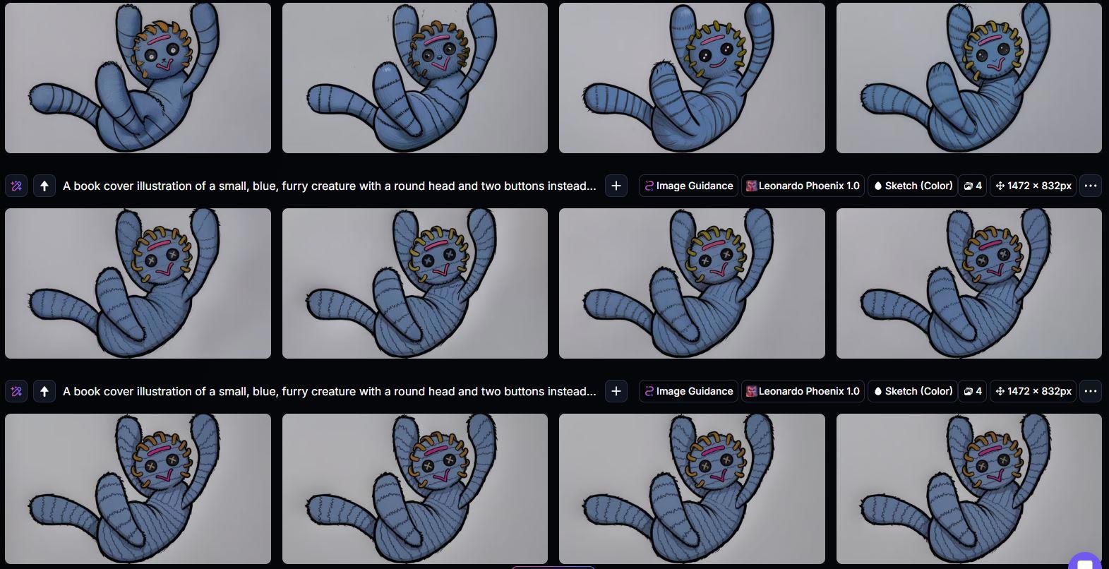 Про куклу, которую ловит Санни, много говорить не буду. Скажу только, что именно она далась тяжелеее всего. Все из-за пресловутой "силы воздействия". Слишком точно воспроизведение моего рисунка выдавало ту же самую куклу, а слишком слабое от 0 до 40%, генерировало какого-то смуфрика. Примеры ниже.