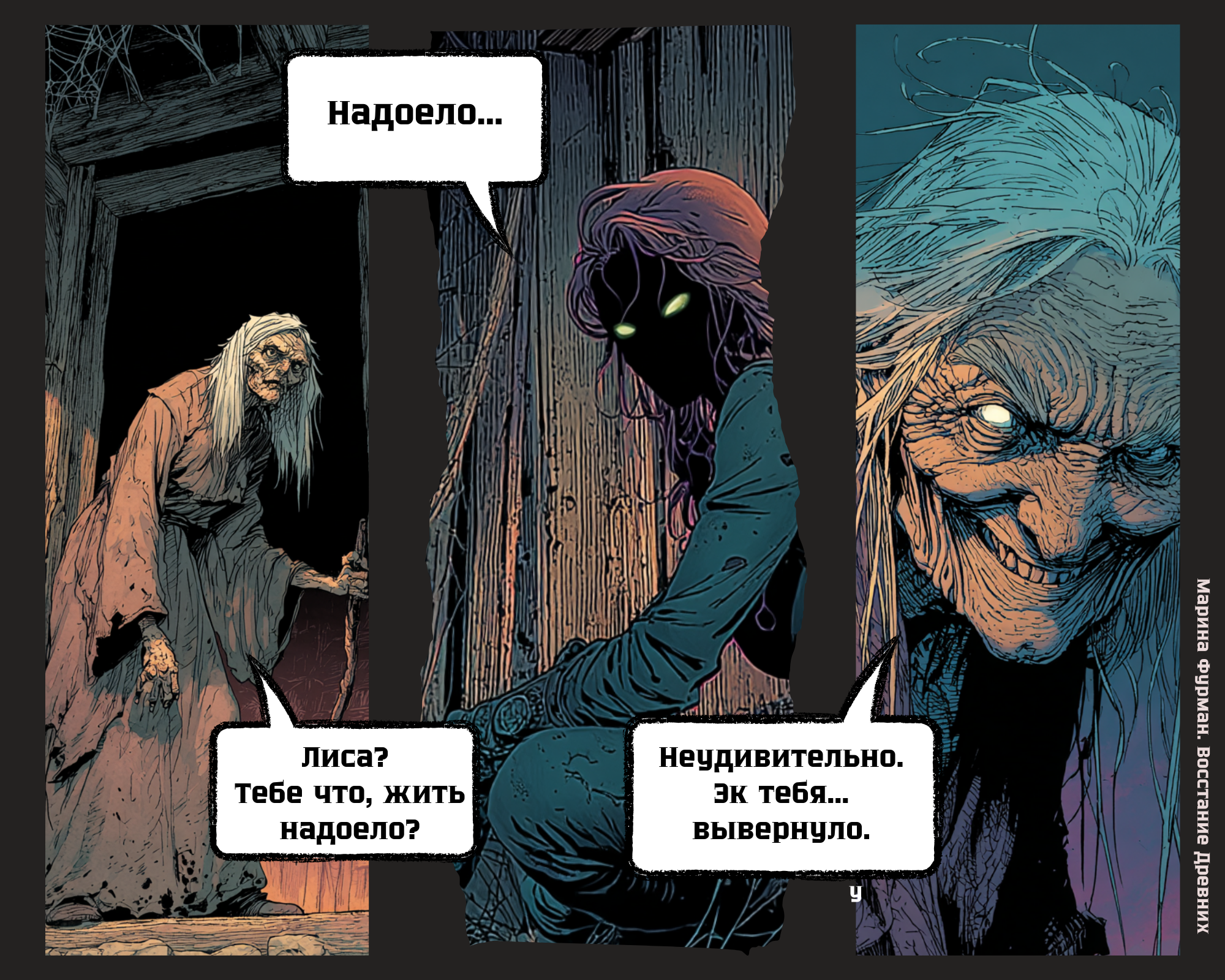 Автор: Марина ФурманСамое сложное для меня в составлении комиксов с помощью нейронки - это выдерживать стиль. У меня есть любимый, основанный на комиксовом стиле и стиле художника Карлоса Швабе, но он от генерации к генерации скачет. И сейчас, сделав комикс для первой главы, я не уверена, что комикс для десятой будет на него похож. Да, я знаю про sref, нет, это не помогает. Энивей, встречайте Лису, которая пришла навестить старую знакомую) Ну, то есть как навестить... по делу пришла, конечно.