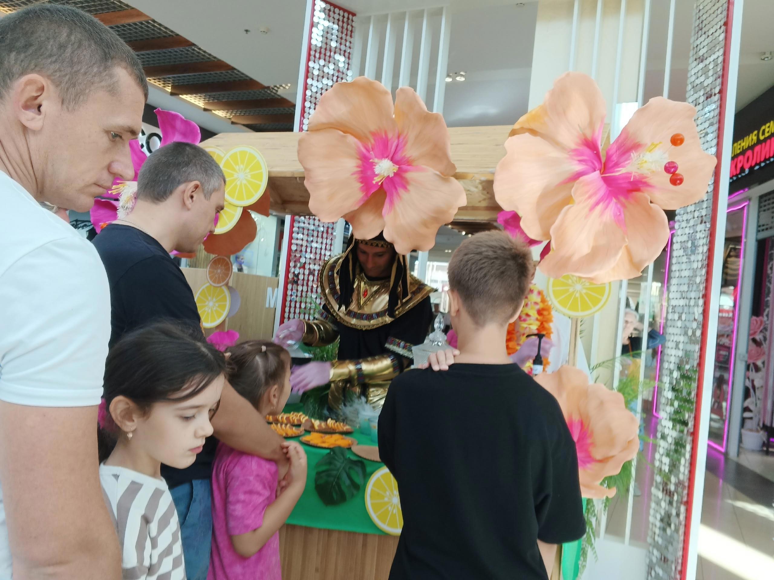 Здесь установлена сцена, на которой ближе к вечеру зазвучит музыка. А пока, вокруг кипит веселье. Дети играют с весёлыми героями мексиканских прерий, с красавицами из Малайзии, а также, на обслуживании в маленьком сладком уголке, стоял древний египтянин.