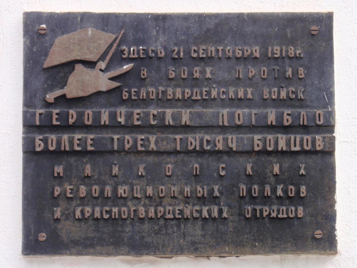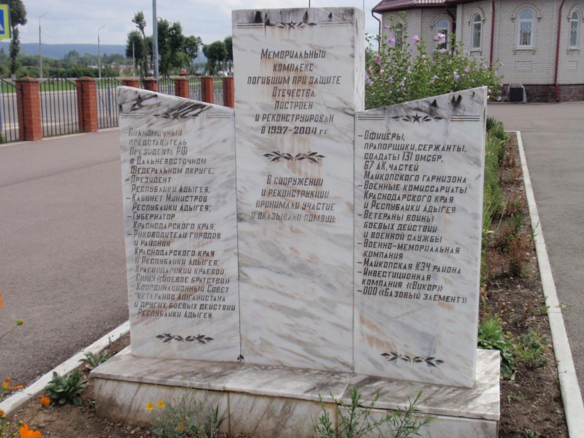 На выезде из города расположен мемориал воинам Майкопской 131-й отдельной мотострелковой бригады, которая почти полностью погибла в январе 1995 года при штурме Грозного. Боевые машины в мемориале – как раз "участники" этого штурма.