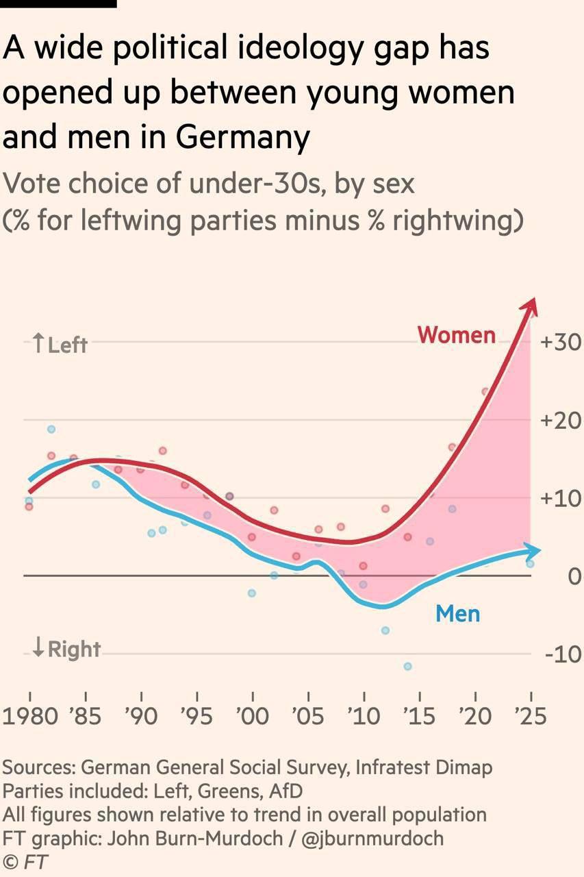 Ещё в начале 1980-х девушки и юноши примерно одинаково поддерживали левые силы, а сейчас разница между ними составляет уже 30 процентных пунктов.
