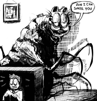 Пройдя в гостиную, он услышал тихое рычание и поспешил спрятаться за тумбой с телевизором, осторожно выглядывая из-за края. Раздутое тело, со множеством рук и отростков, рыжая шерсть заляпана кровью. Раздутая голова с огромной пастью из которой обильно течёт слюна. Это был Гарфилд.