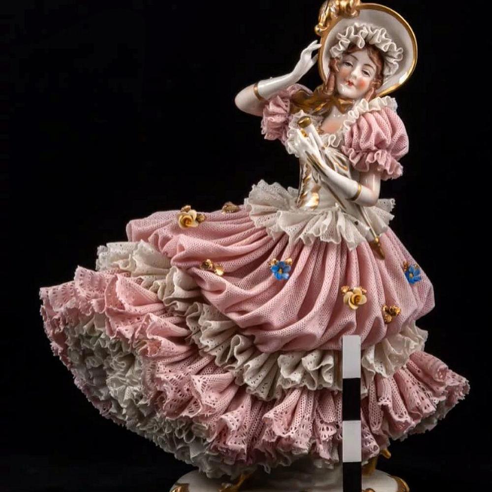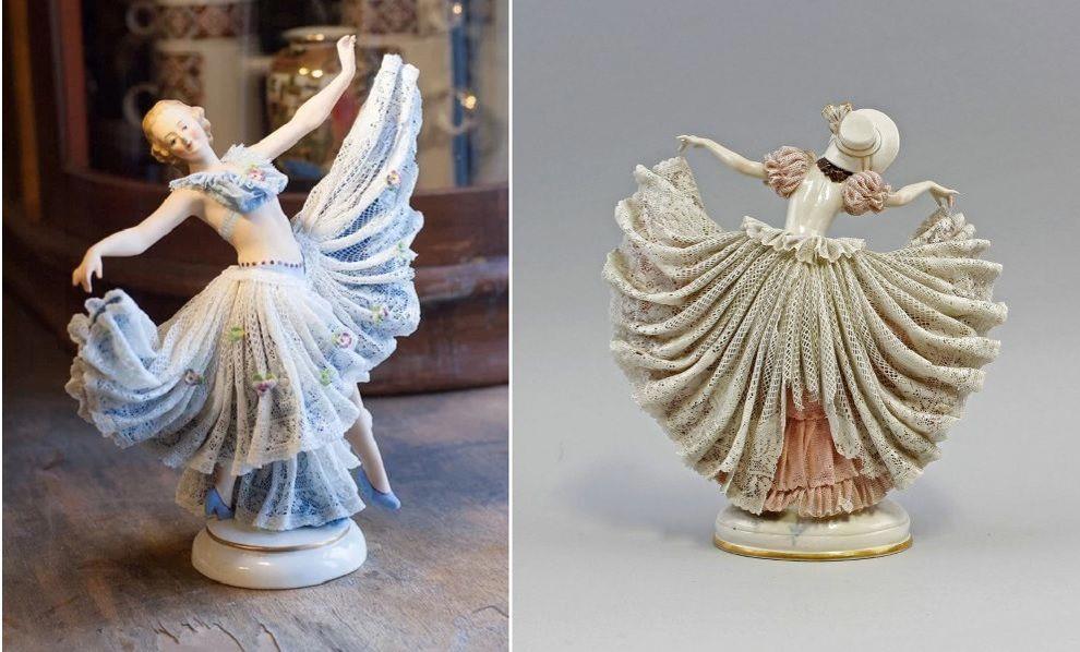 Чтобы получить такой эффект, мастера брали настоящее текстильное кружево, погружали его в раствор фарфора и на самой статуэтке придавали форму платьям, юбкам, оборкам. Затем отправляли «одетую фигурку» в печь на обжиг и происходило настоящее волшебство.
